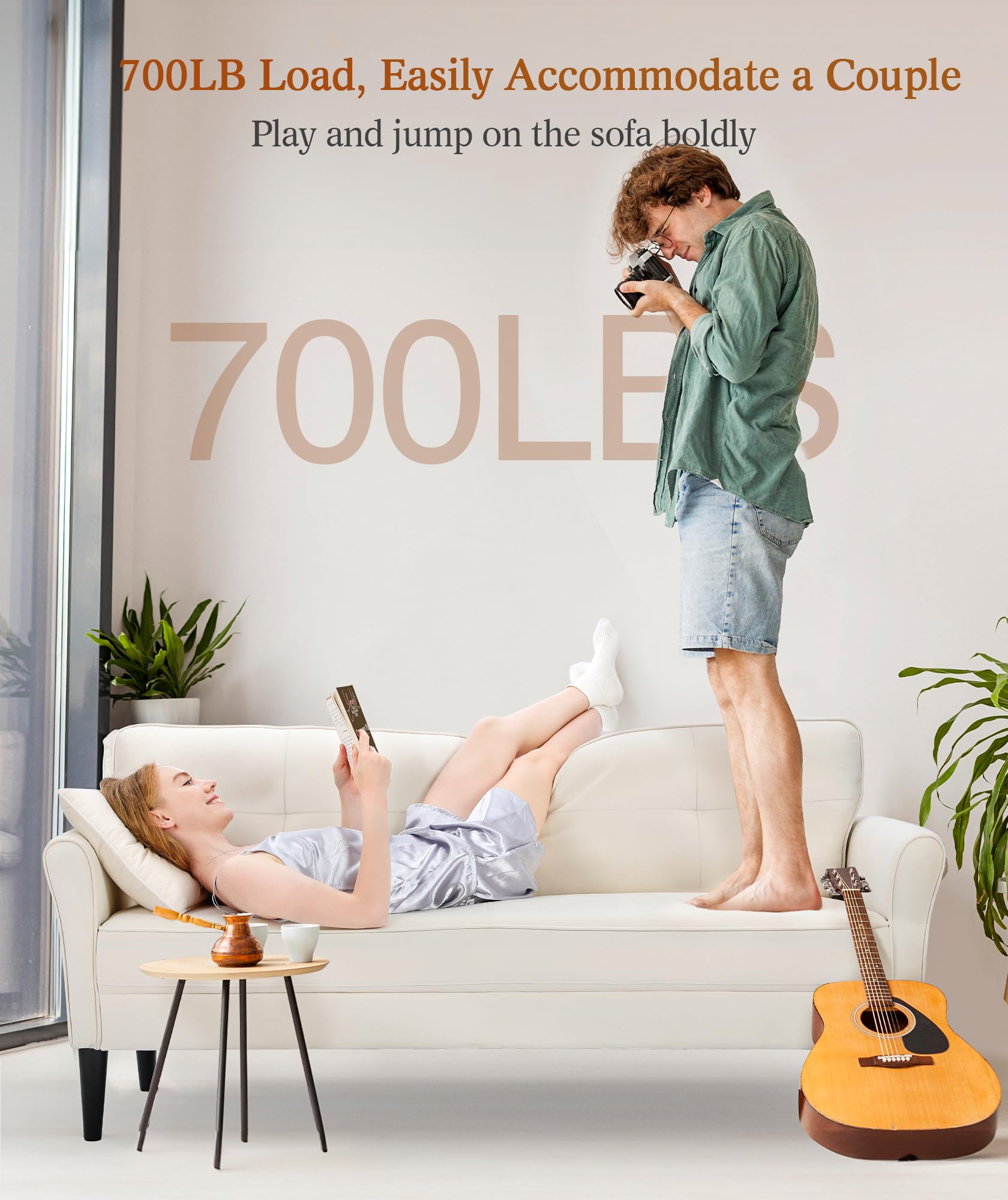 - Are you still worried that the beige couch will shake and affect your experience during use? Now you can rest assured that you can play and jump on the sofa boldly, and the sofa is still stable. Made of high-quality and sturdy solid wood for the sofa frame and legs, the wood texture is fine and delicate. With great support and a stable structure, It can support a maximum weight of 700LB and stably support you and your family's happiness. (Sofa size: 69" W x 29"D x 33"H)