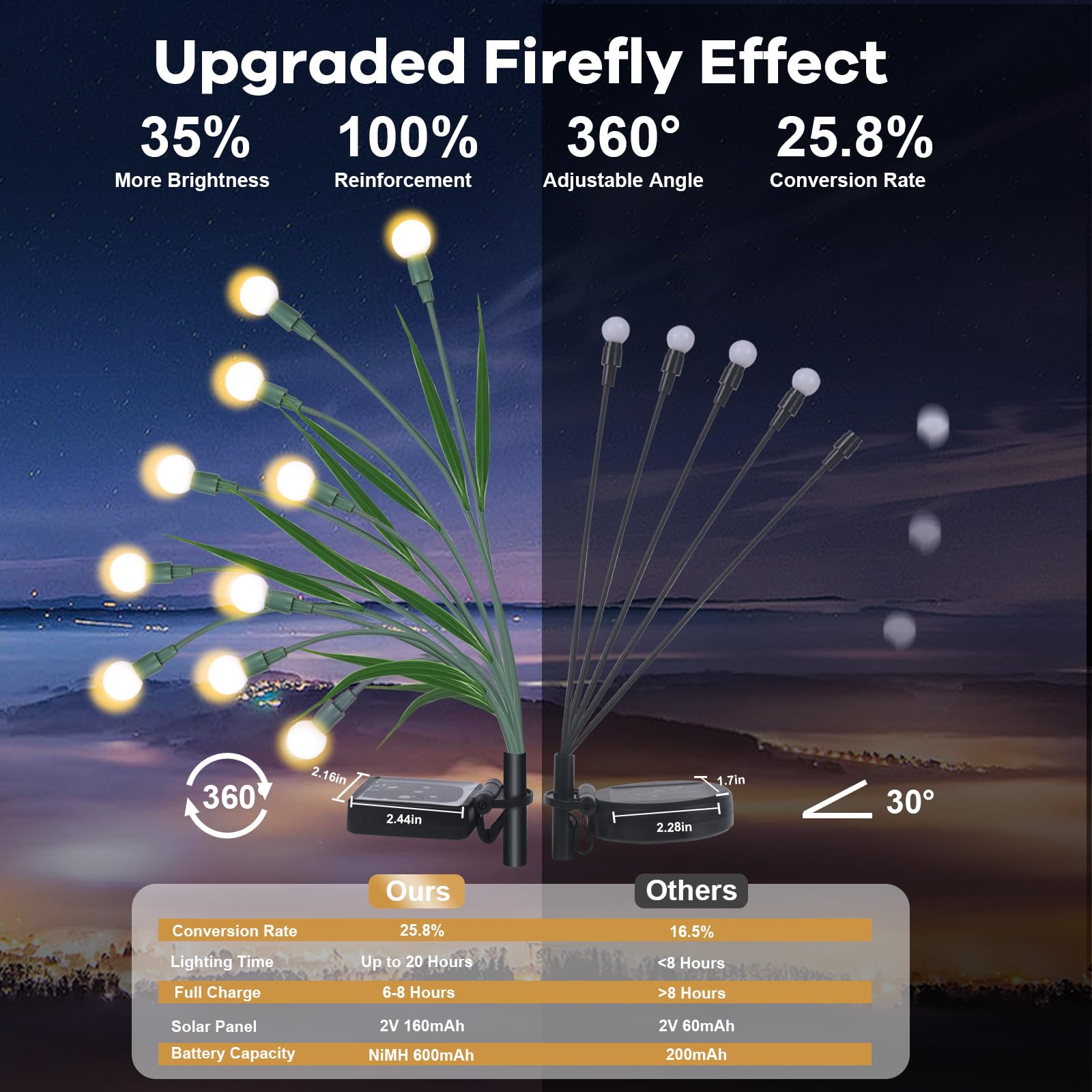 - Upgraded Larger Size Solar Panels - Our solar firefly garden lights upgraded by using monocrystalline solar panel, the solar energy conversion efficiency up to 25.7%, exceeds 99% solar charging efficiency on the market, worry-free charging even on cloudy or short winter days. Built-in 600mAh Ni-MH batteries, sustain up to 20 hours of work after being fully charged, lighting for all night long.
