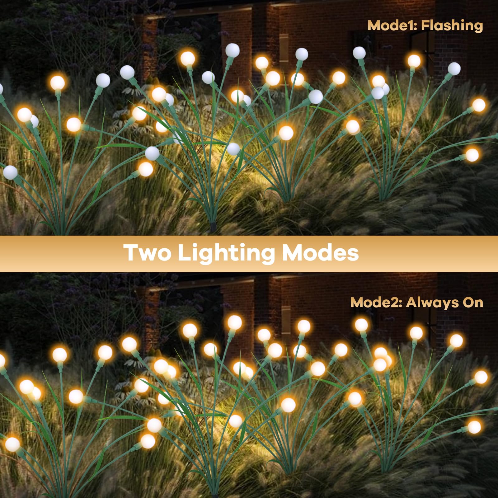 - Two Lighting Modes - The outdoor solar garden stake lights are designed with two lighting modes, first mode is flash, the second mode is steady on. Built-in memory chip saves your last modes setting, no need to reset when the lights auto-on next time.