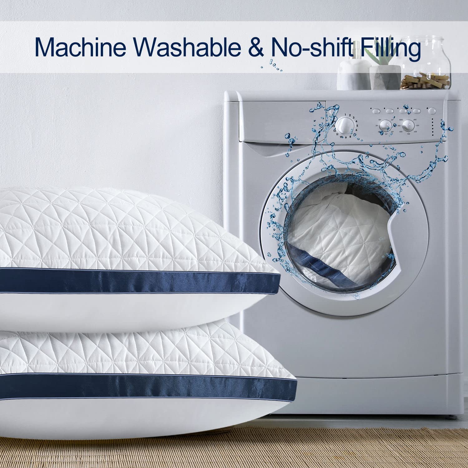- EXQUISTE DETAILS PILLOWS: Our Pillows are added quilted embossing on front side, it embossed with extra filling to make it more plush, other side is normal side, you will have two choice for your prefer side. Double piping craft with sapphire blue gusseted band design not only give a better look, but also helps hold it's plush shape, won’t flatten out after longtime use. Each details are aim to maximizing its‘ comfort and improving your sleeping experience