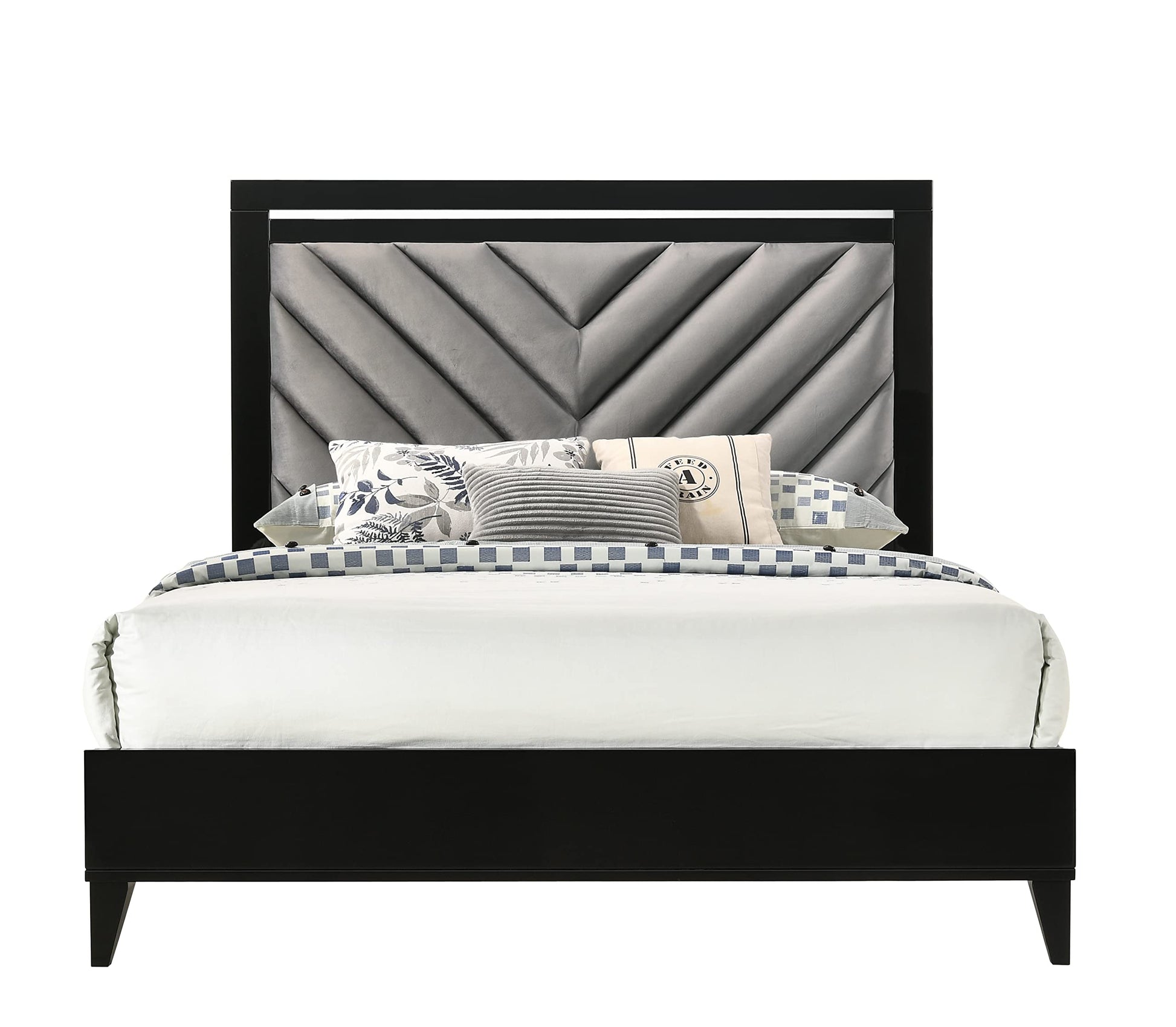 - Featuring a gorgeously upholstered headboard with silver accents for a sophisticated finish.
