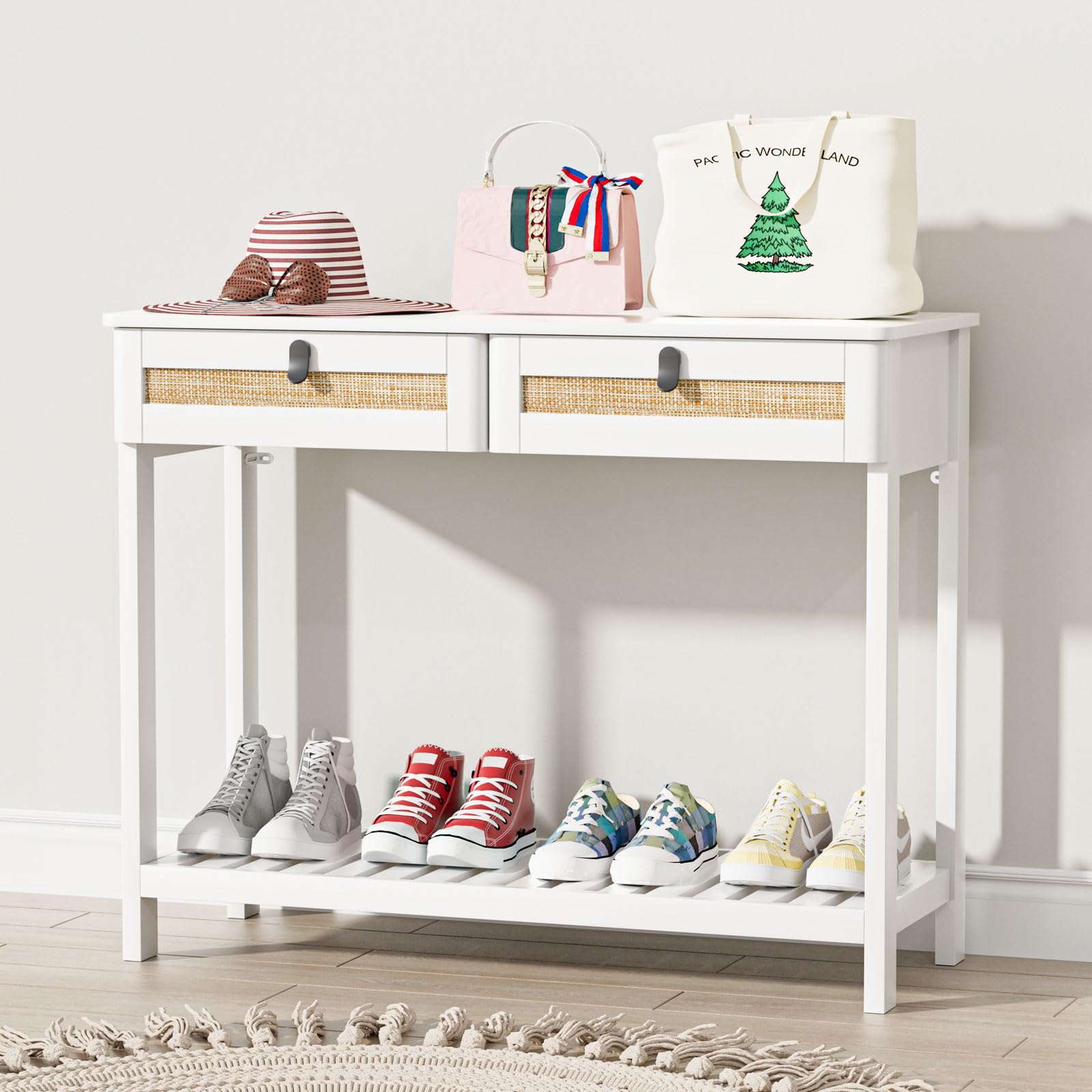 Knowlife Rattan Console Table with Drawers, Entryway Table Sofa Table with Storage Shelf, Narrow Long Behind Couch Table for Entryway, Living Room, Hallway, White