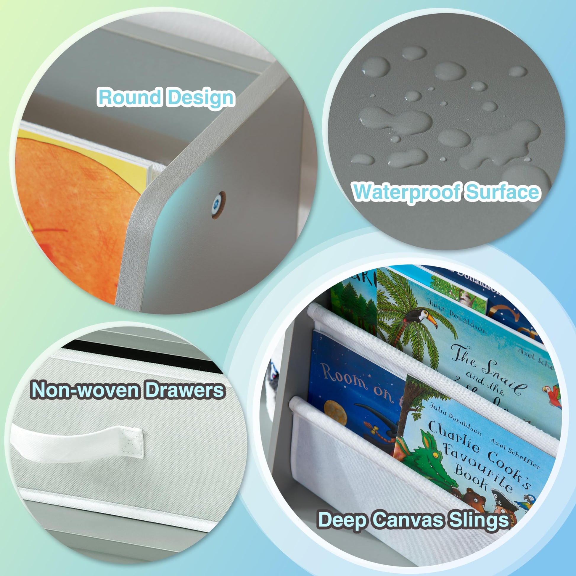 Kids Bookshelf with 2 Storage Boxes and 4 Sling Bookcase, Toddlers Book and Toy