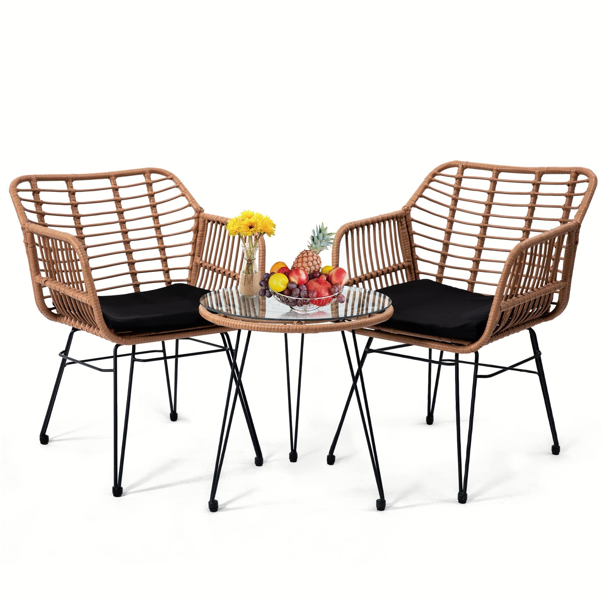 3 Pieces Wicker Patio Bistro Furniture Set, Includes 2 Chairs and Glass Top Tabler