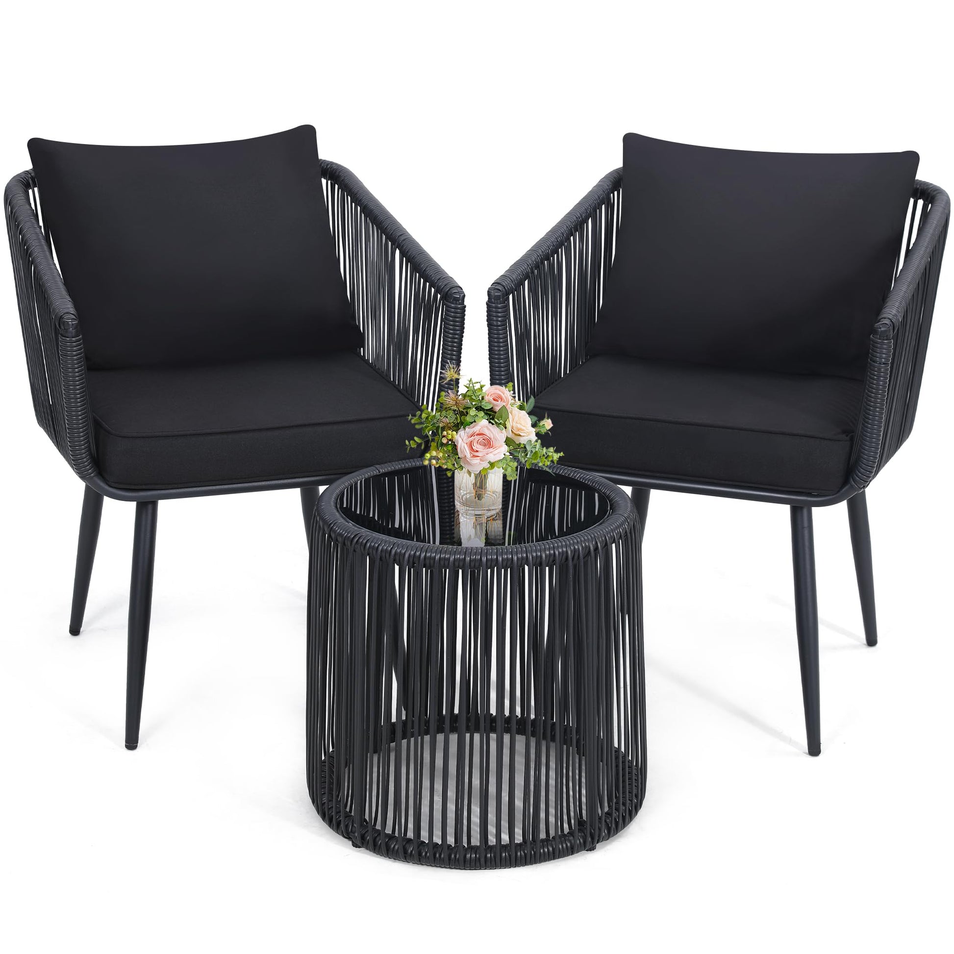 - Each 3 pieces bistro conversation set includes 4 overstuffed waterproof zippered cushions, 1 cocktail table with a tempered glass top, and 2 boho style indoor outdoor chairs.