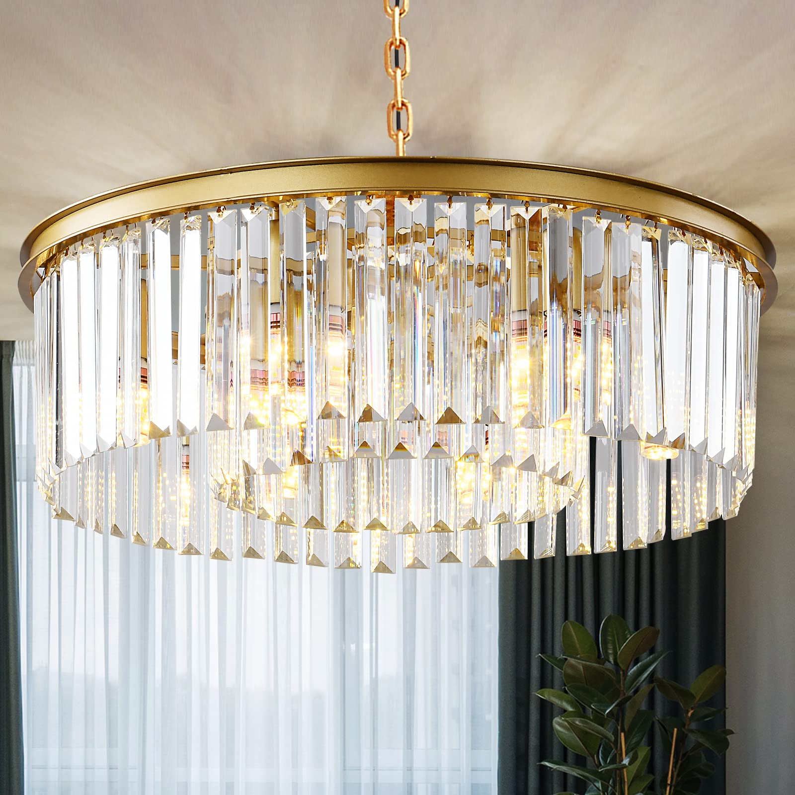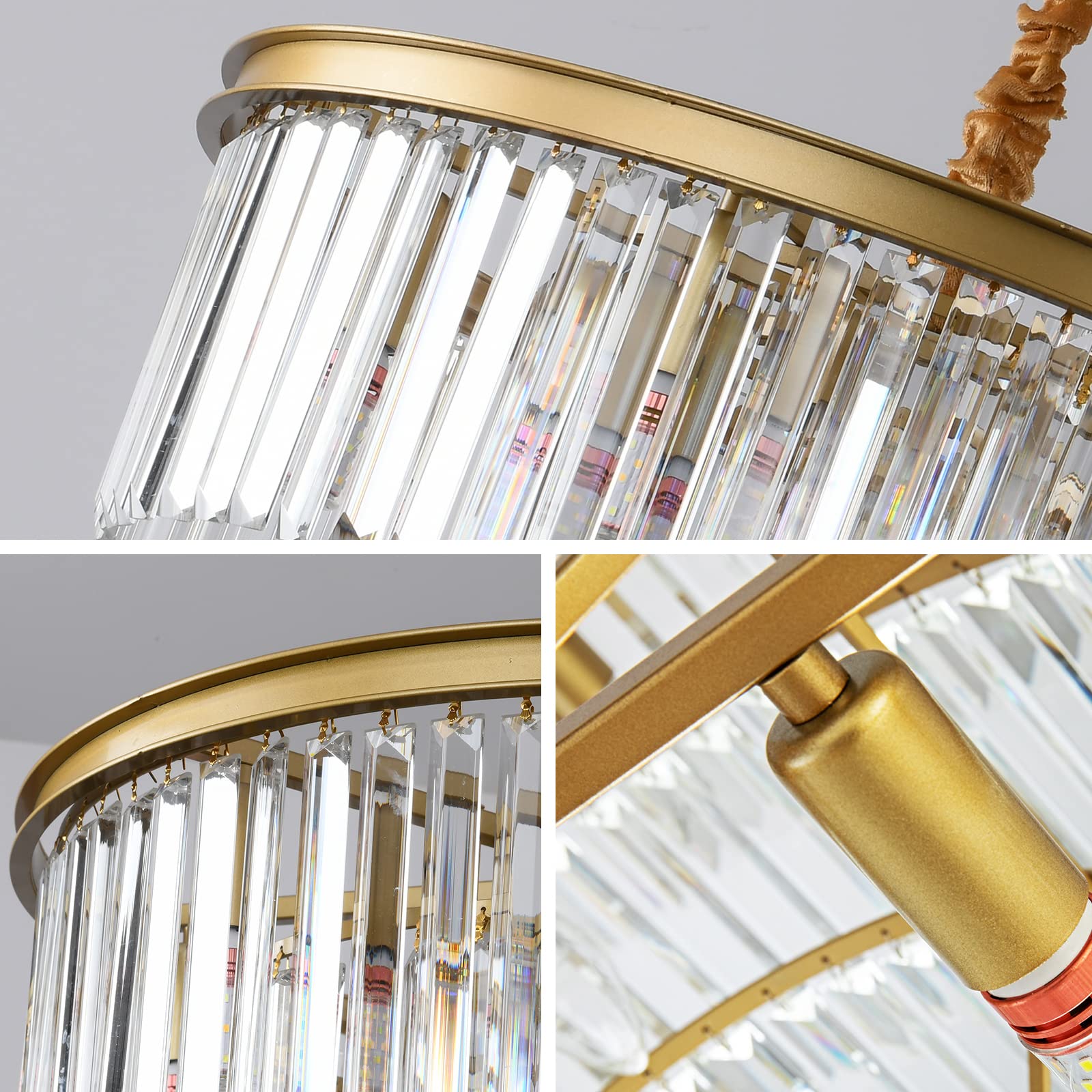 - This gold crystal chandelier combines classic and modern elements with eye-catching results, cascading tiered clear crystal, like diamond sparkly charming. Perfect for dining room, living room, kitchen island, bedroom, hotel, etcModern crystal chandelier finished in gold frame and K9 clear crystal, perfectly blends classic industrial and modern luxury style. Diameter 21.65 inches/55CM * Height 7.09 inches/18CM, Chain Length: 39.37 inches/100CM (Adjustable).