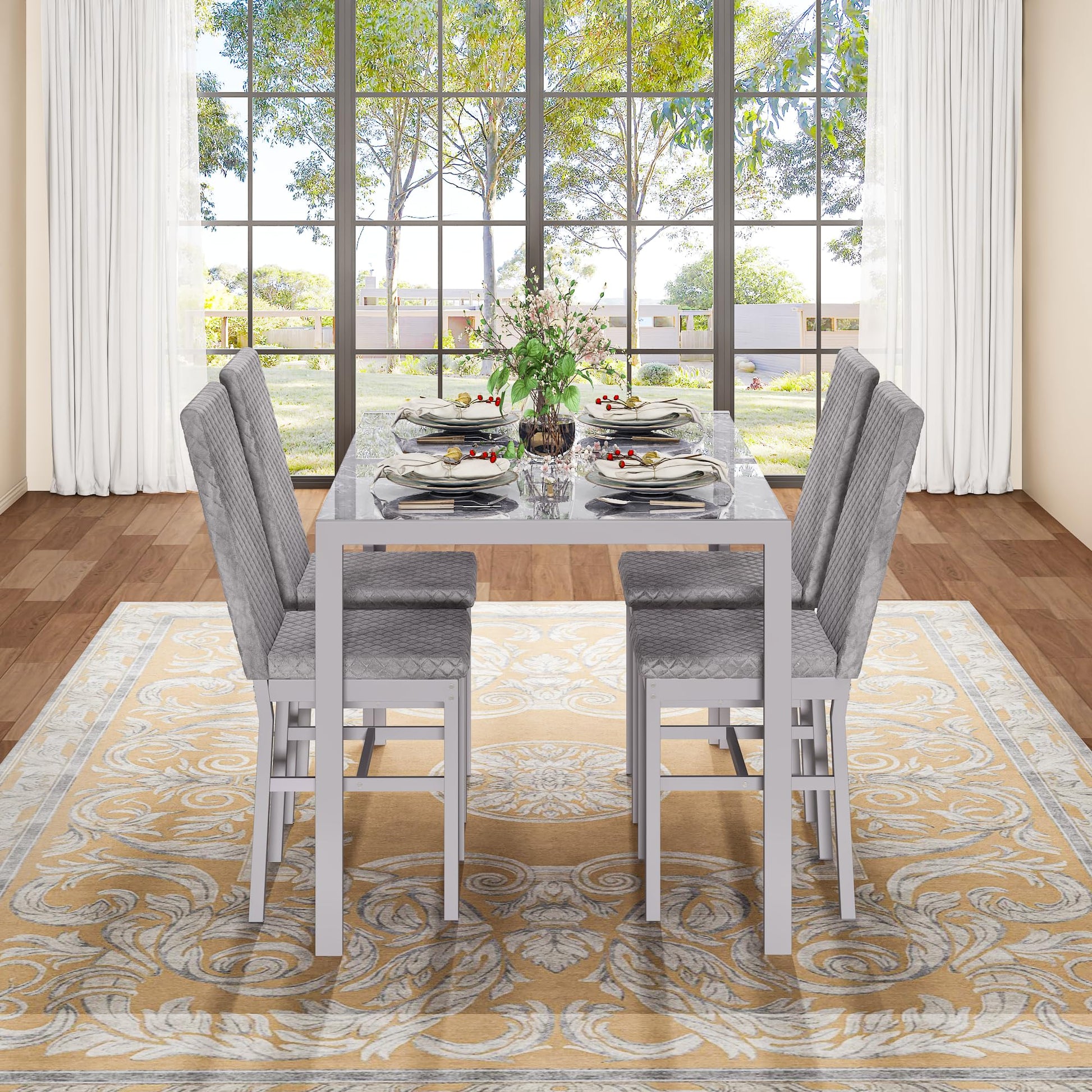 - This dining set consists of 1 glass dining table and 4 grey diamond pattern design velvet chairs, the simple and generous design is suitable for different decoration styles. And the surface of our kitchen table set are waterproof, you can easily wipe off soup, dust and other dirt, which greatly extends the length of use of this dining table set. This set is the perfect choice for your home, help improve your quality of life.