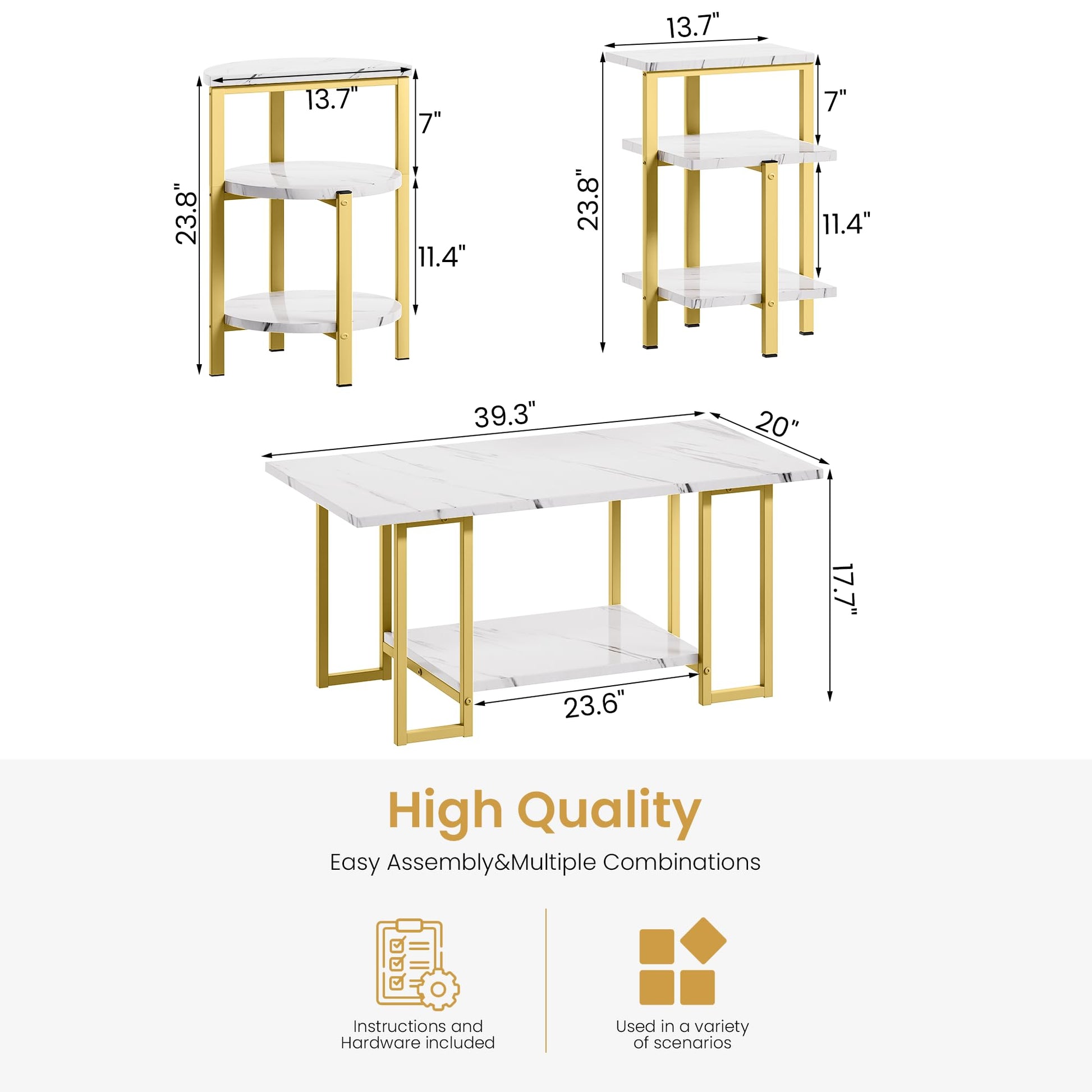 - The Smooth table top make it easy to clean, Simple design and it will take you short time to put together, instructions, tools and hardware included, Marble coffee table overall: 39"L x 20"W x 18"H; 2 sofa tables overall: 15.7"L x 13.7"W x 23.8"H.