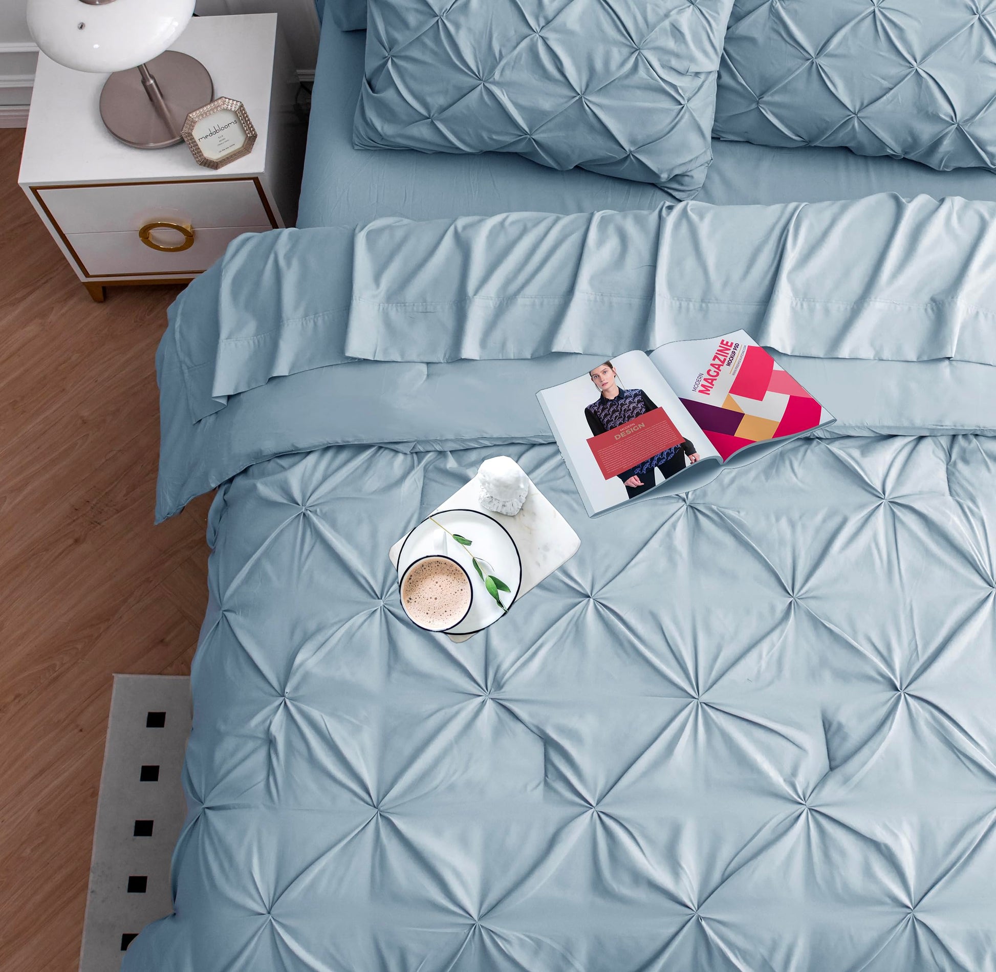 - Elegance Redefined: Suit any home décor, with our complete King Bedding Comforter Set. Merging pinch pleats and geometric patterns, it transforms your space into a stylish retreat. Experience the exceptional softness of the fine brushed microfiber sheets, pillowcases & shams, for a satisfying feel ever time you rest.