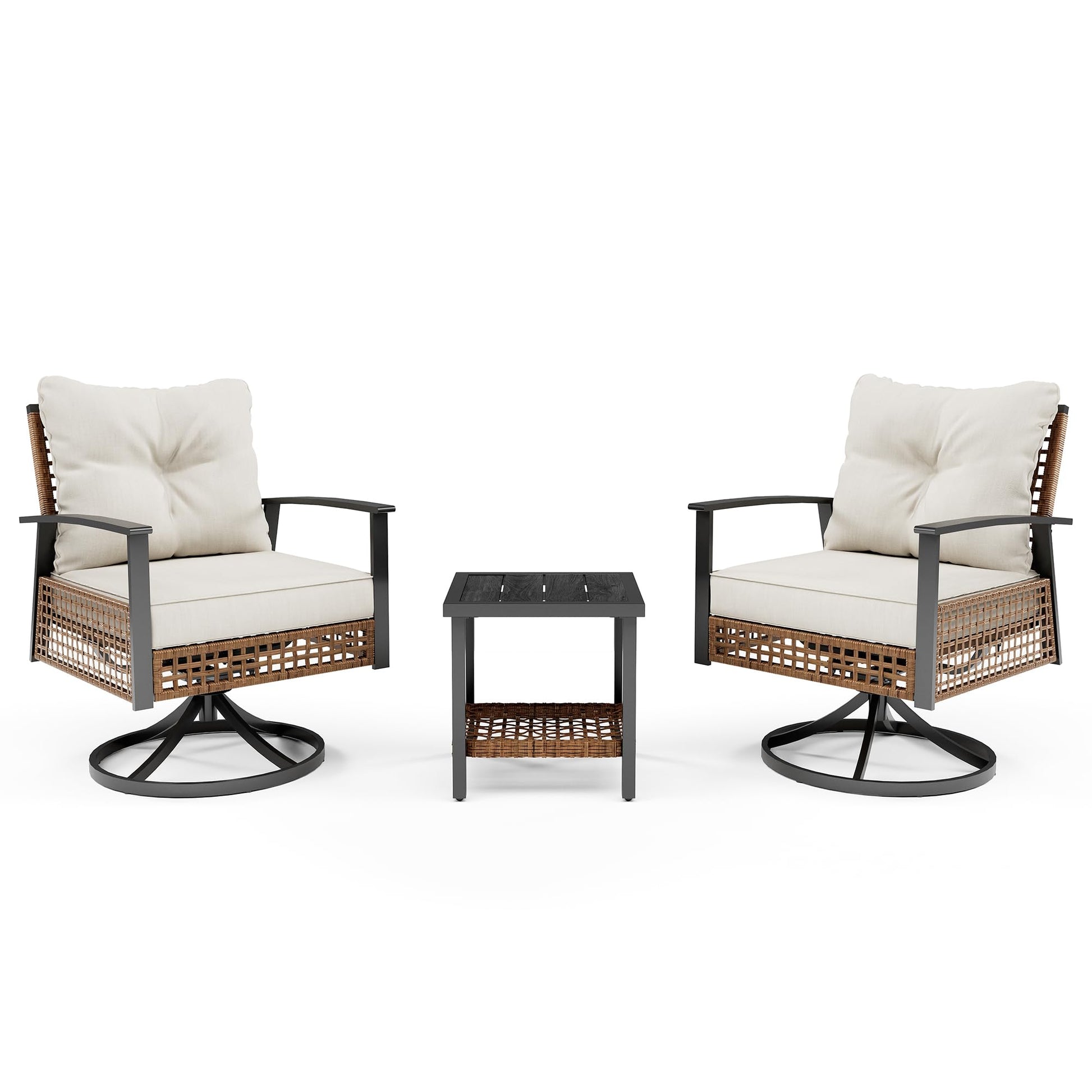 - The frame of the outdoor swivel chair is crafted with high-quality galvanized steel pipes that are rust-resistant and fade-resistant. Compared to ordinary rattan, the wider rattan used is more durable. The polyester fabric is water-repellent and offers excellent abrasion resistance, making this patio furniture set suitable for various outdoor scenes such as gardens, patios, porches, etc.