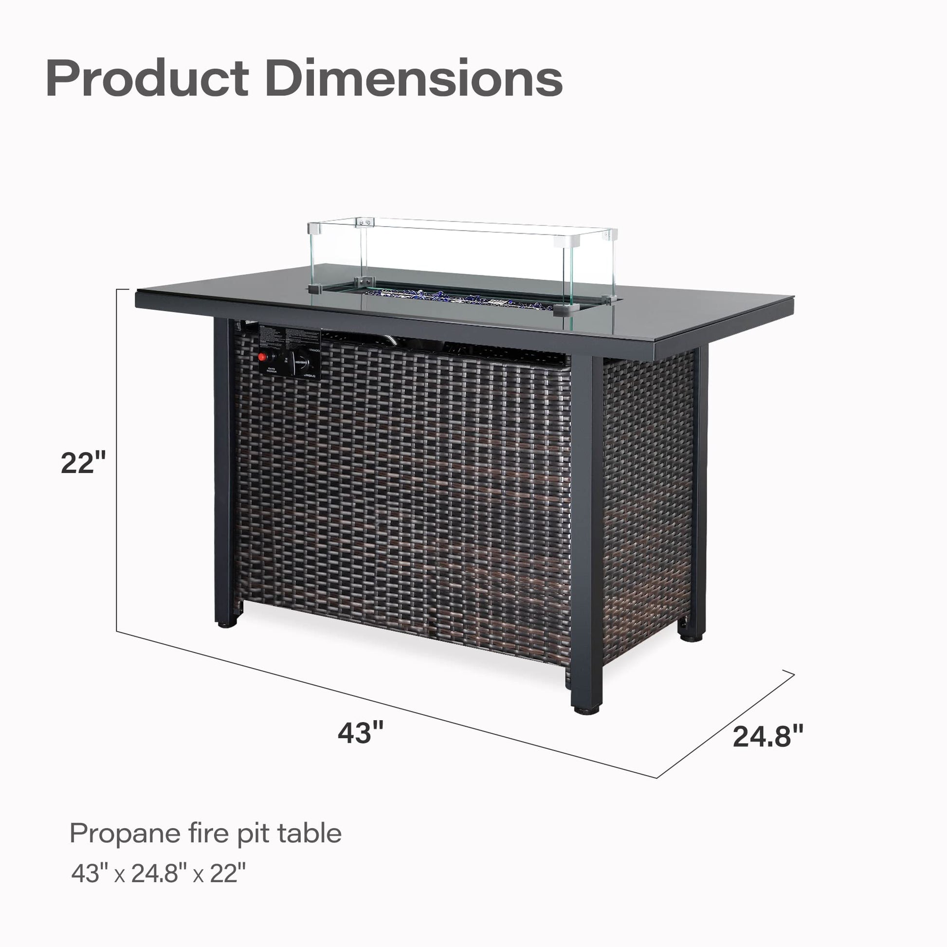 - SUITABLE SIZE The size of the fire pits is L 43" x W 22" x H 24.8" including one fire pit table with burner lid, tempered glass wind guard, 11lbs glass stone, accessories bag, and product manual. With our clear manual, it's easy to assemble it, just needs some time. If you have any other needs or questions, pls contact us, 24 hours service for you.