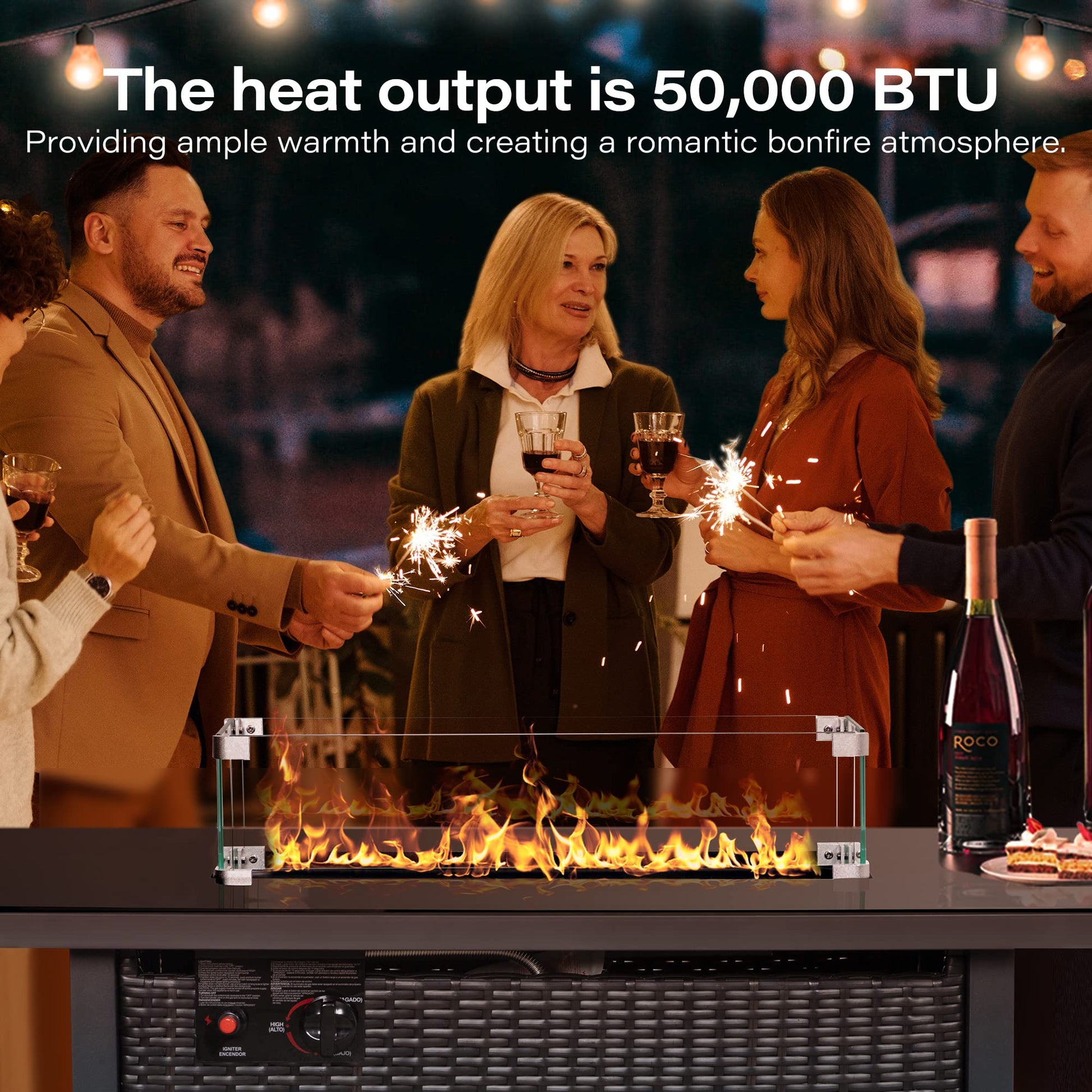 - CERTIFIED SAFETY Each table has been tested before reaching our users, this propane fire pit table is CSA certified and has the highest safety standard of 50,000 BTU burner-rated power. whether you’re hosting an outdoor party after the sun has gone down, or you want to snuggle up with your family and chat into the early hours, our fire pit can provide you with enough heat to keep you warm.
