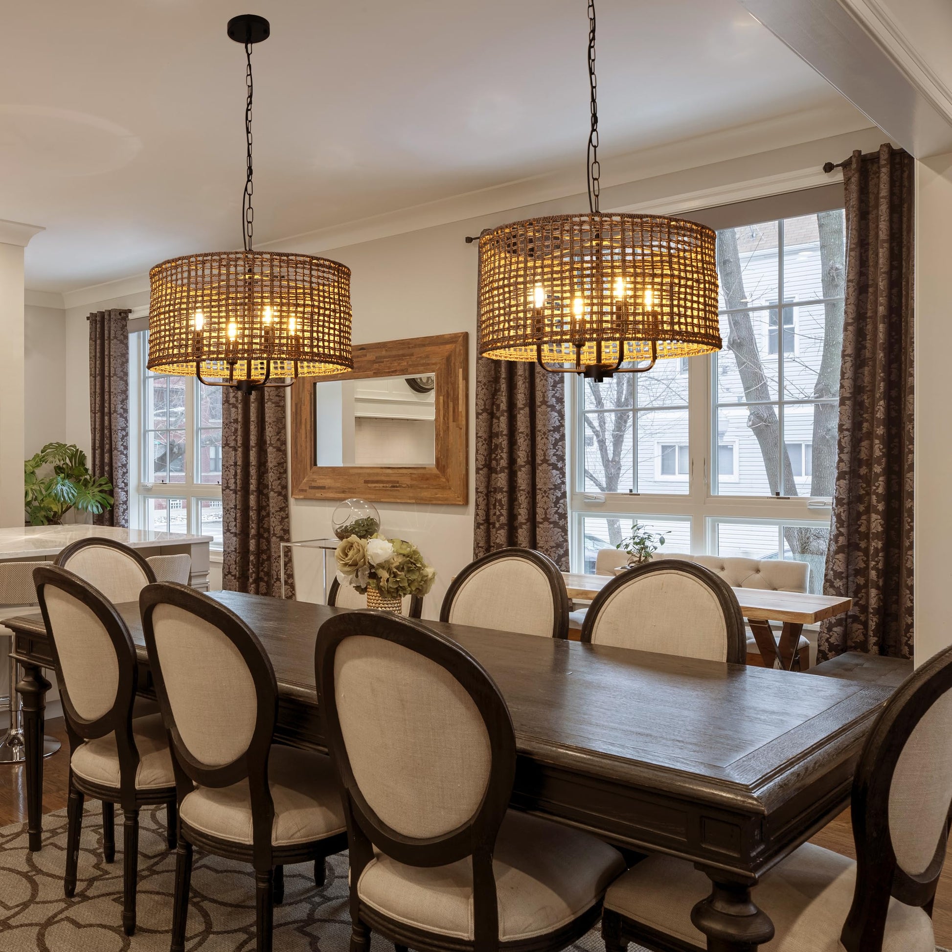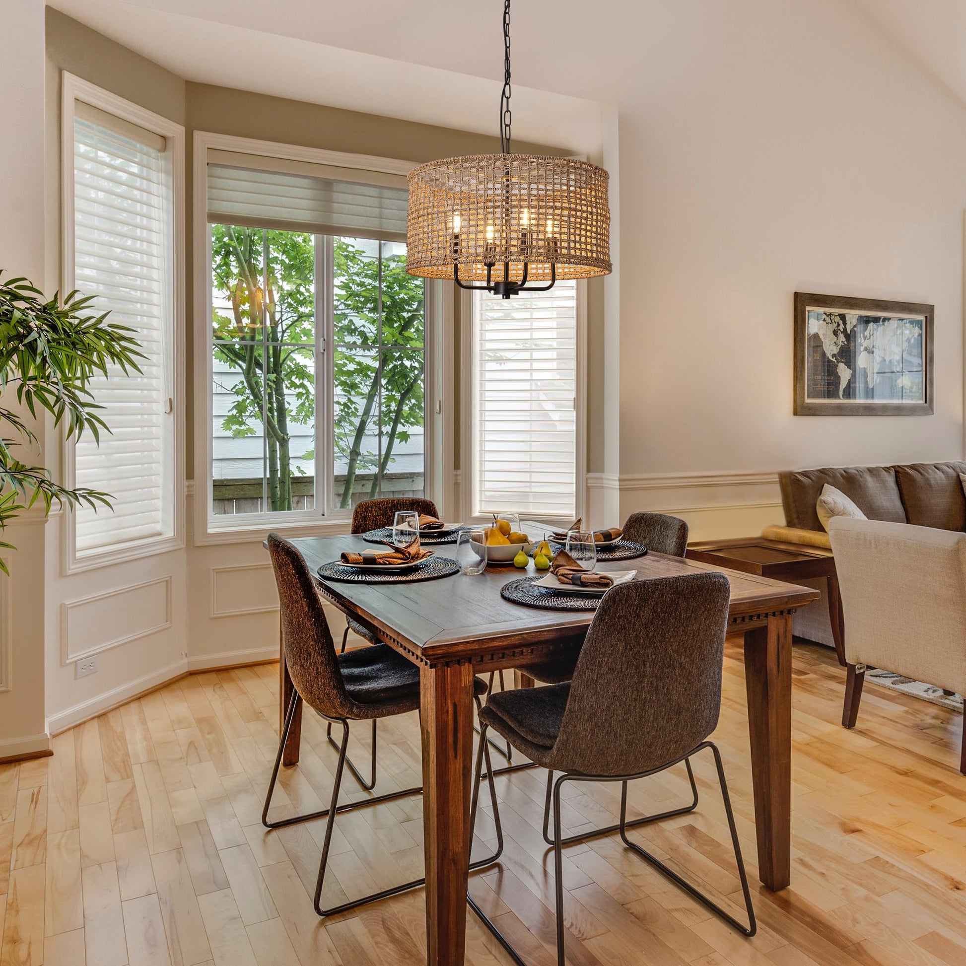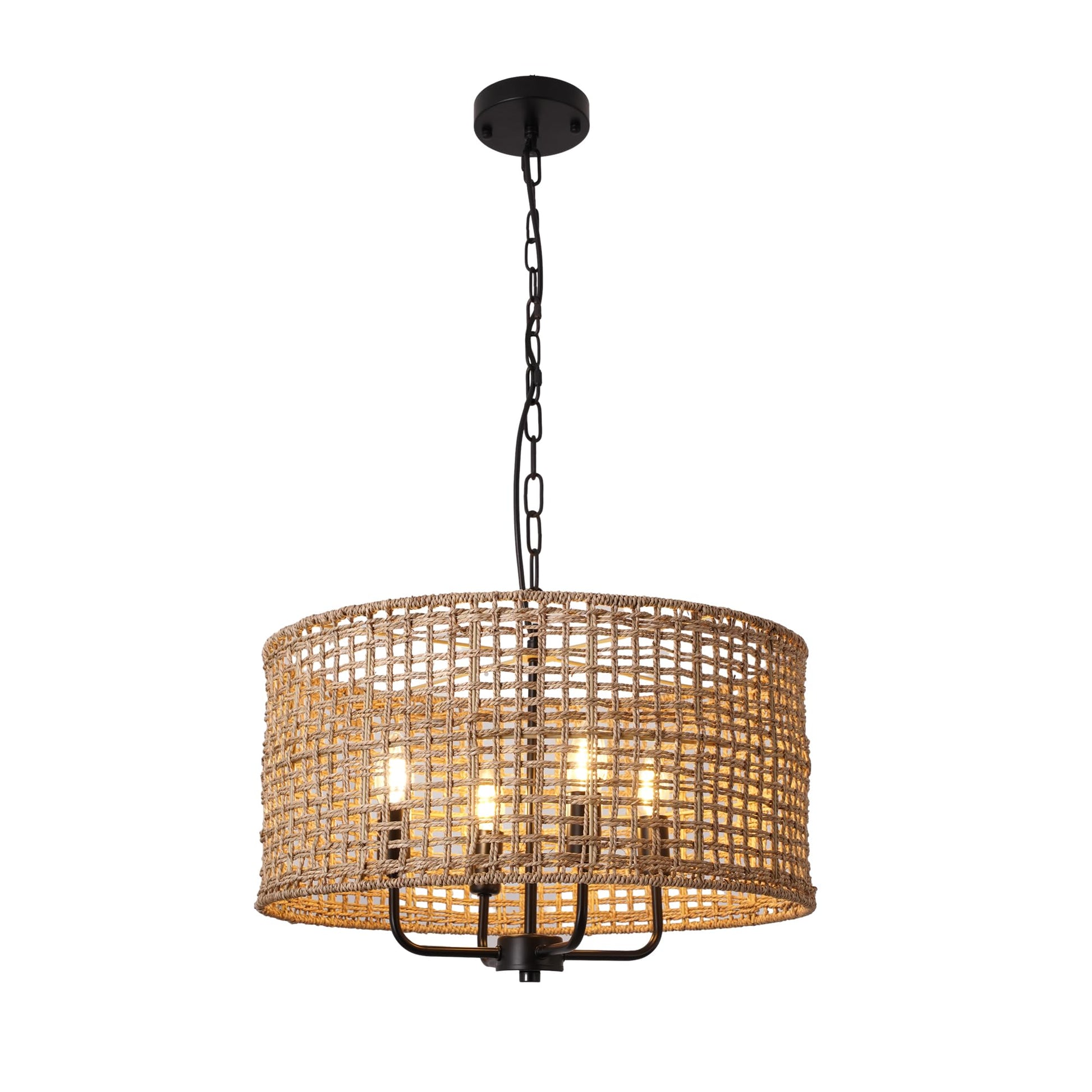 - Rattan Chandelier Style: This Boho chandelier pendant light fixtures is designed with black canopy and hand woven drum lampshade which is crafted of natural rattan/seagrass. Filtering the light from within, each piece creates a play of light and subtle shadow in a room, adding an inviting ambience. Make a style statement with the coastal-inspired organic chandelier light