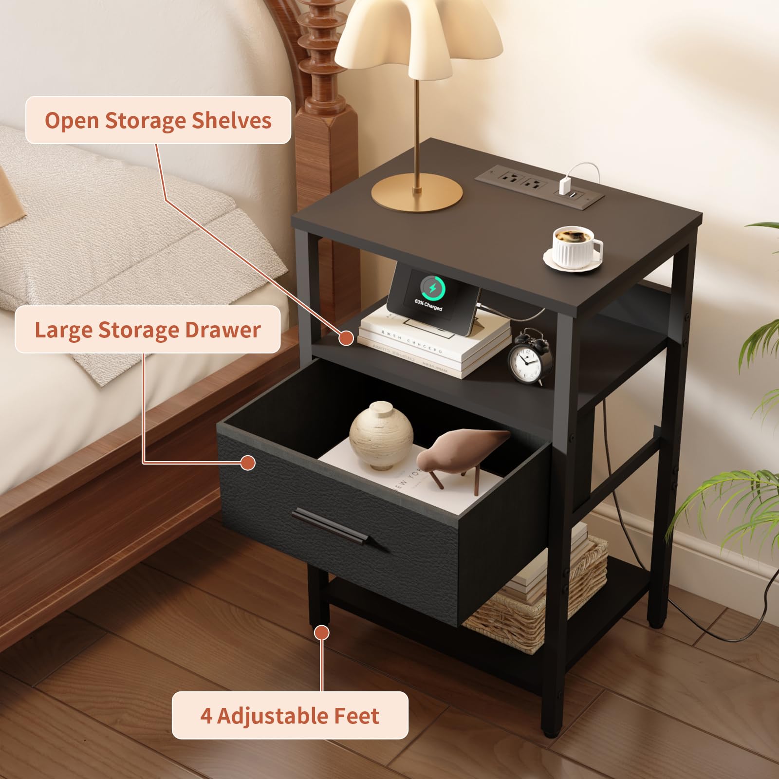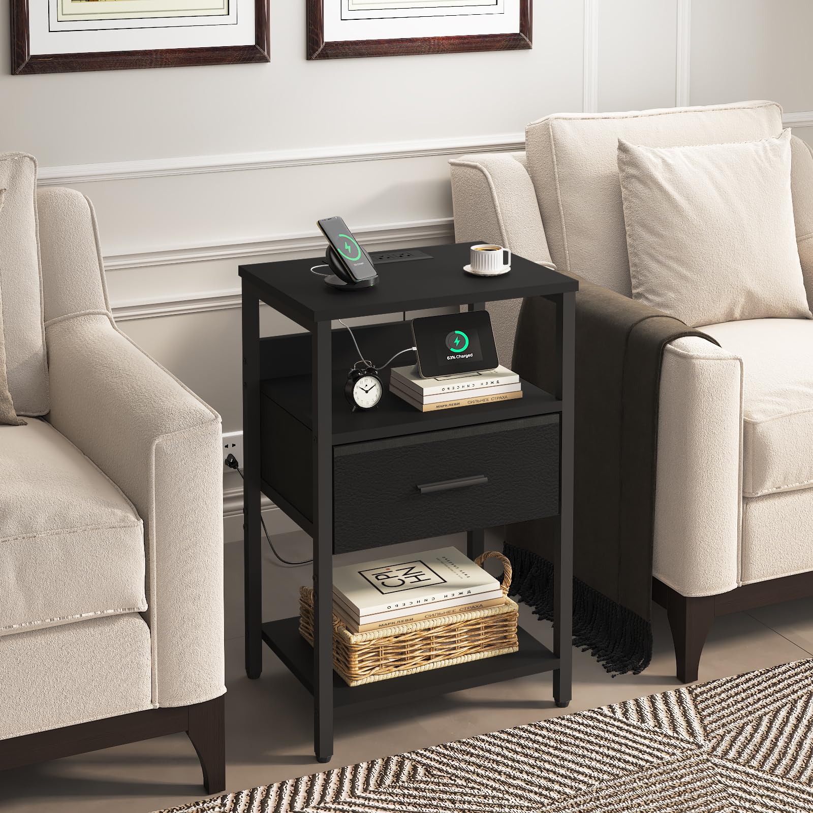 Nightstand with Charging Station, Bedside Table with USB Ports and Outlets
