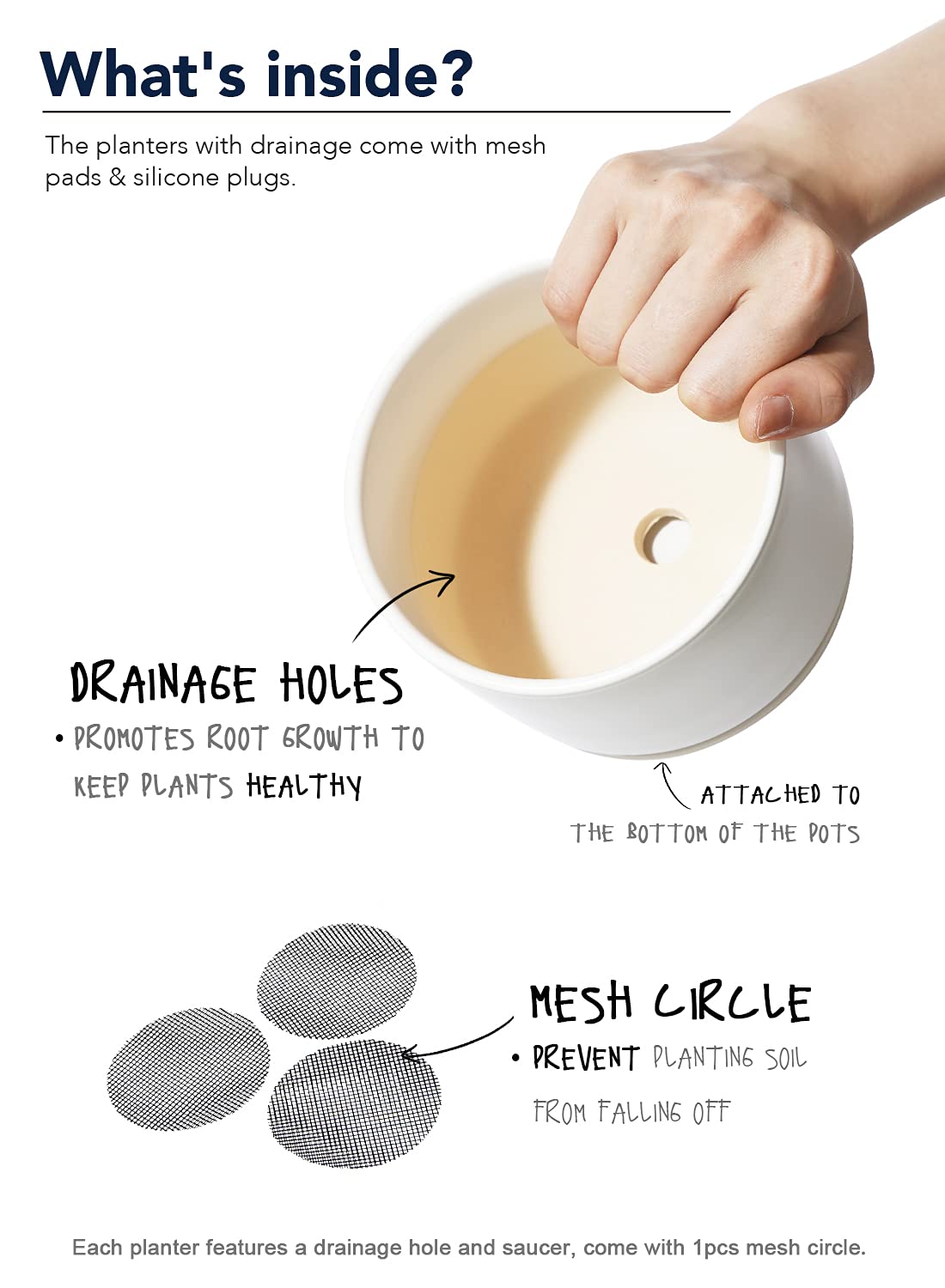 - Pots With Drainage Hole & Drip Pans & Drainage Net - The hold in the bottom allows the excess water to exit out of the soil when you’re watering the plant. The drainage plates are attached to the bottom of the pots and do not come off. Drainage Net is included, which is designed to prevent planting soil from falling off. (*Plant is NOT Included.)
