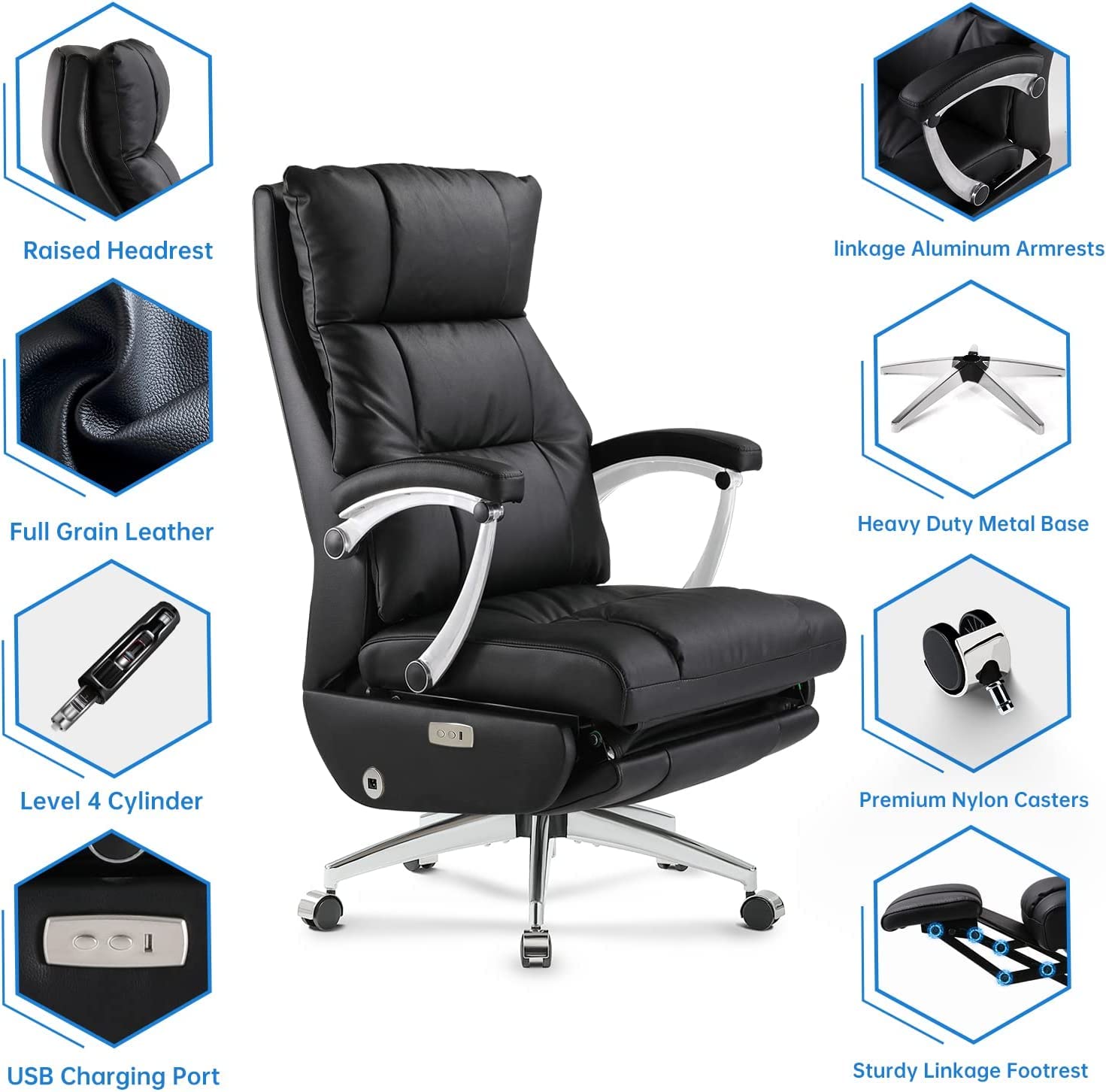 - Built-in 1800mAh FCC, UL, CE, ROHS certified high-capacity Li-ion battery, the LEAGOO ergonomic office chair can be adjusted electrically between 90°-160° by one button and adjusted up and down at a range of 2.4 inches, you can lock the backrest at any angle (90°-160°) and adjust the height to find your optimal position. Also, a linked footrest gives you a more comfortable resting experience. Built-in USB port can charge your iPhone.
