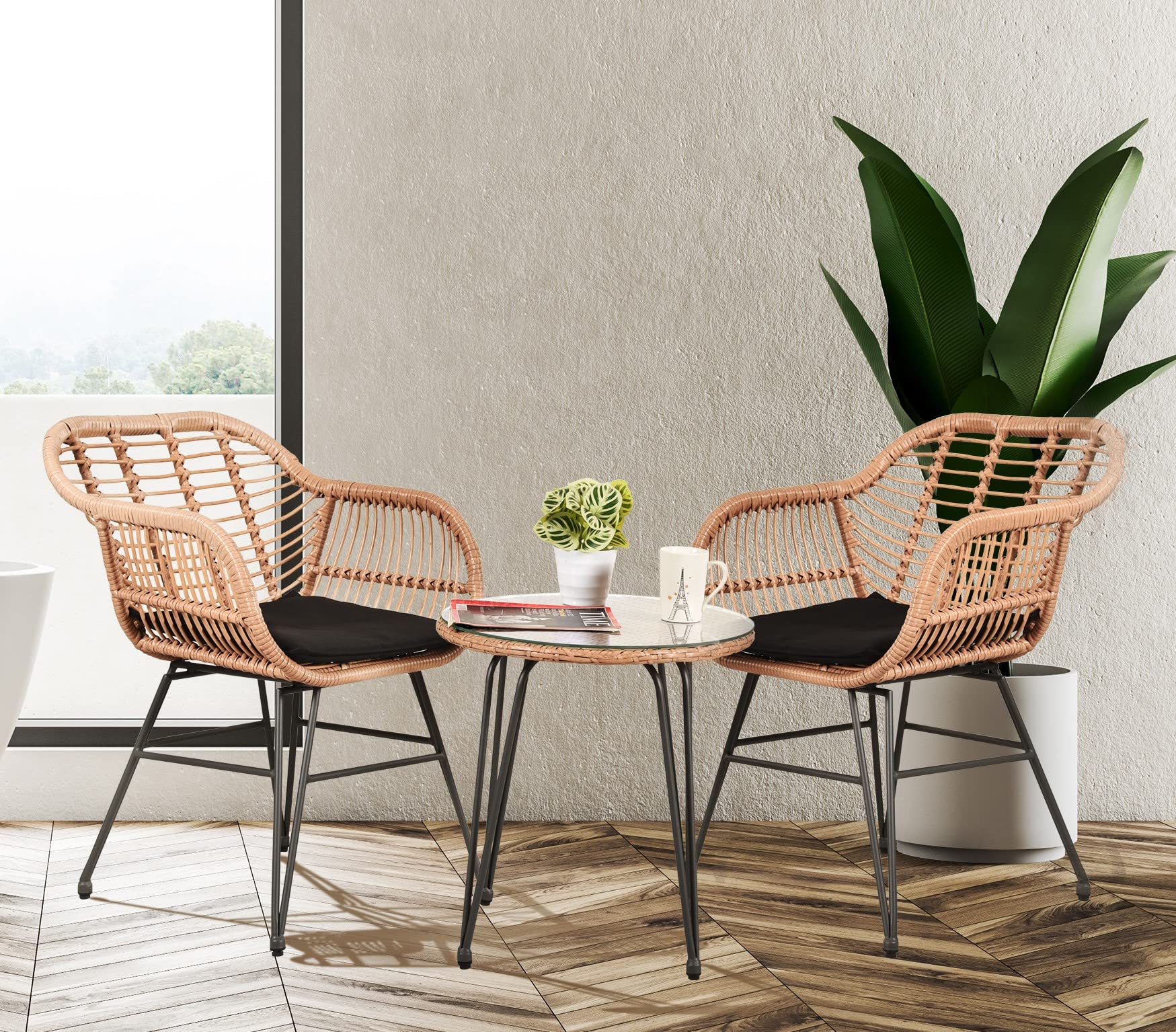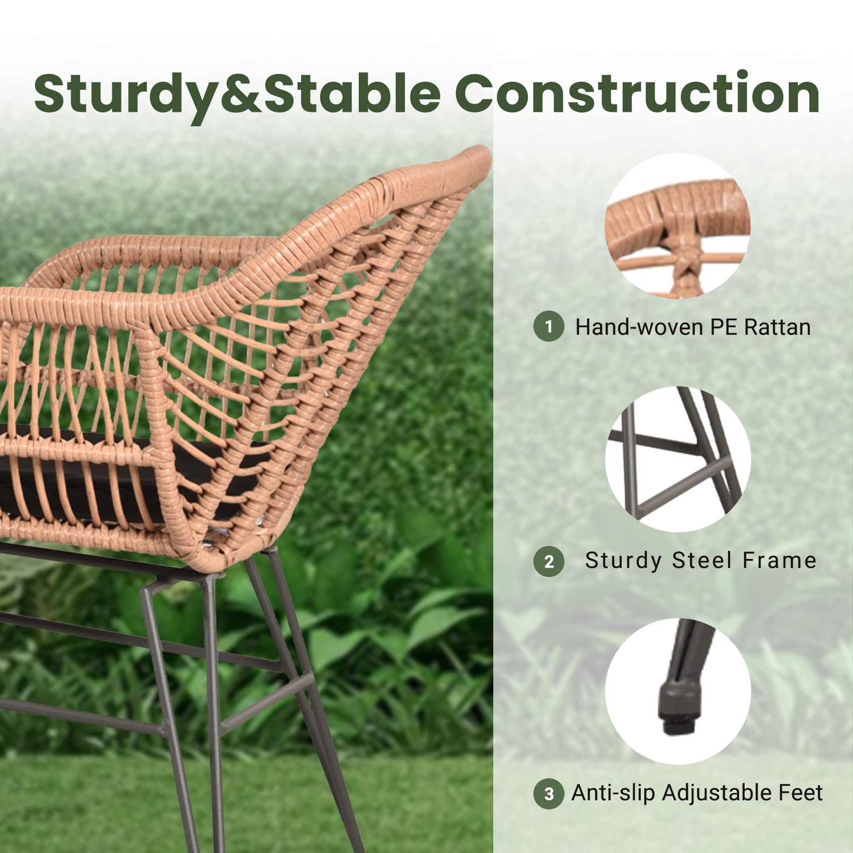 - Sturdy & Durable Bistro Set The outdoor chairs and table set is mainly made of strong steel, wrapped and decorated by high quality PE-rattan, which is rustless in outdoor for long time use. This patio rattan set features a large load-bearing capacity and hardly deforms for garden use.