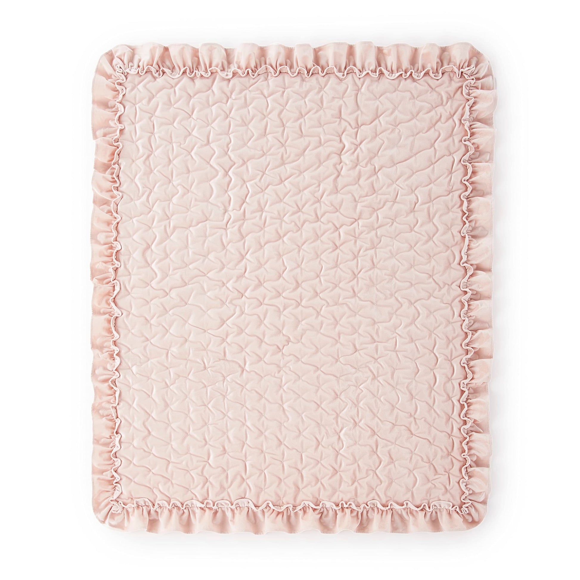 - REGAL VELVET THEME: You will think you are sleeping in a glamorous palace with our smooth blush velvet look. The fitted sheet is sweet delicate floral bouquets in pink on a white ground. The changing pad cover features a soft plush white center with blush, grey and white medallions all around. The quilt features lush velvet tacked down with a flowing ruffle all around. The bedskirt has a simple yet beautiful blush toile, while the large nursery wall decal depicts , completing your sm