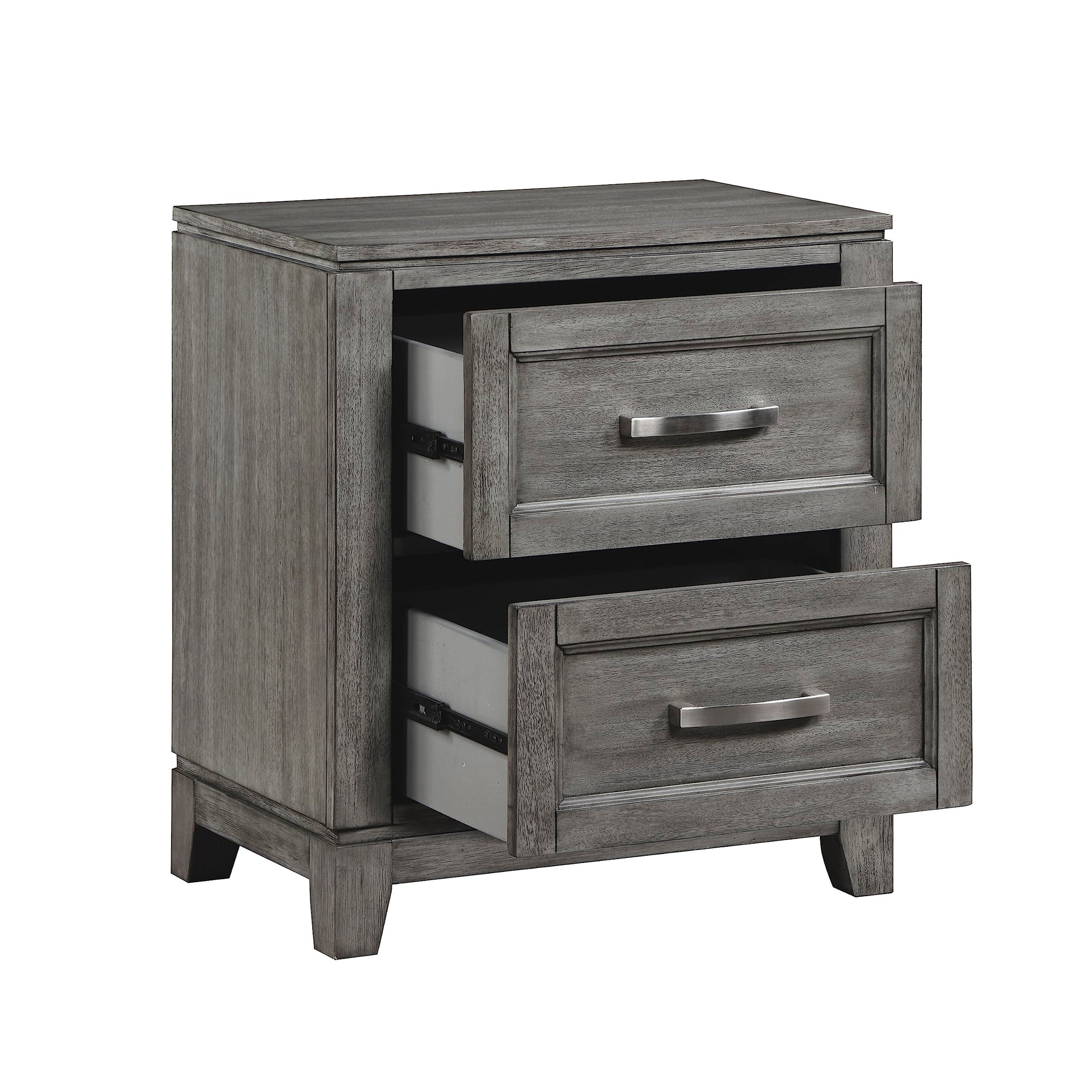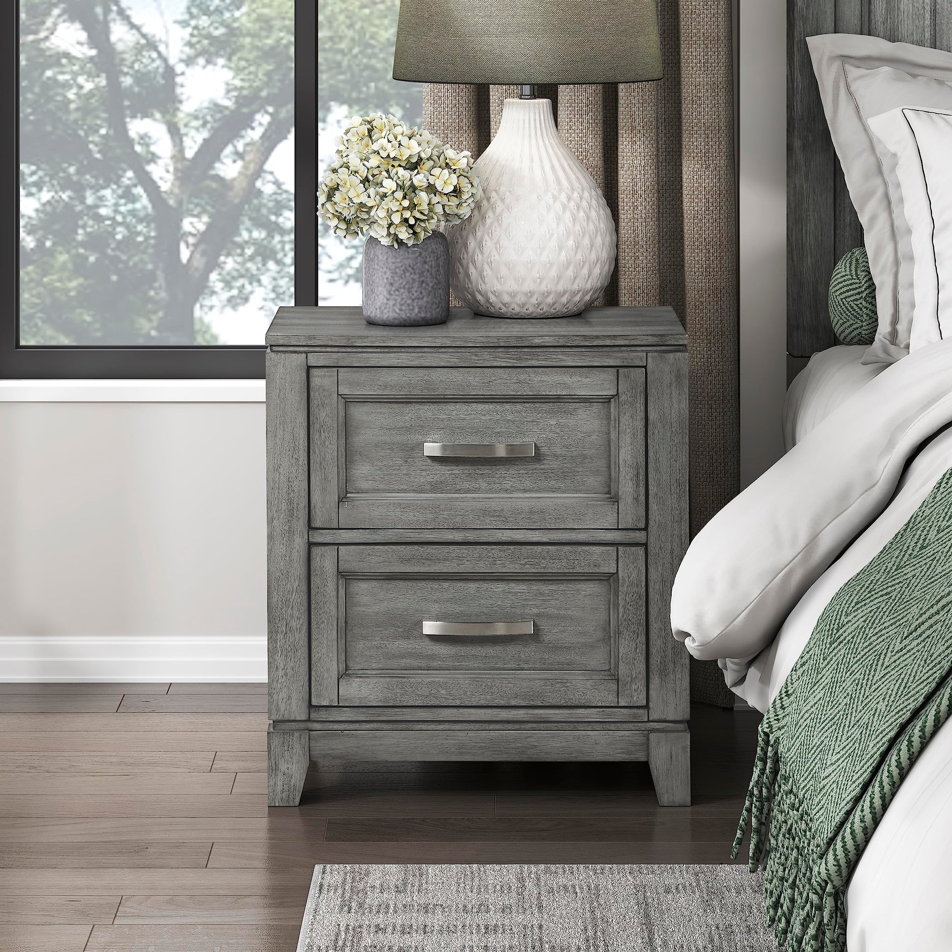- Transitional Look + Gray Finish + Satin Nickel Bar Pull