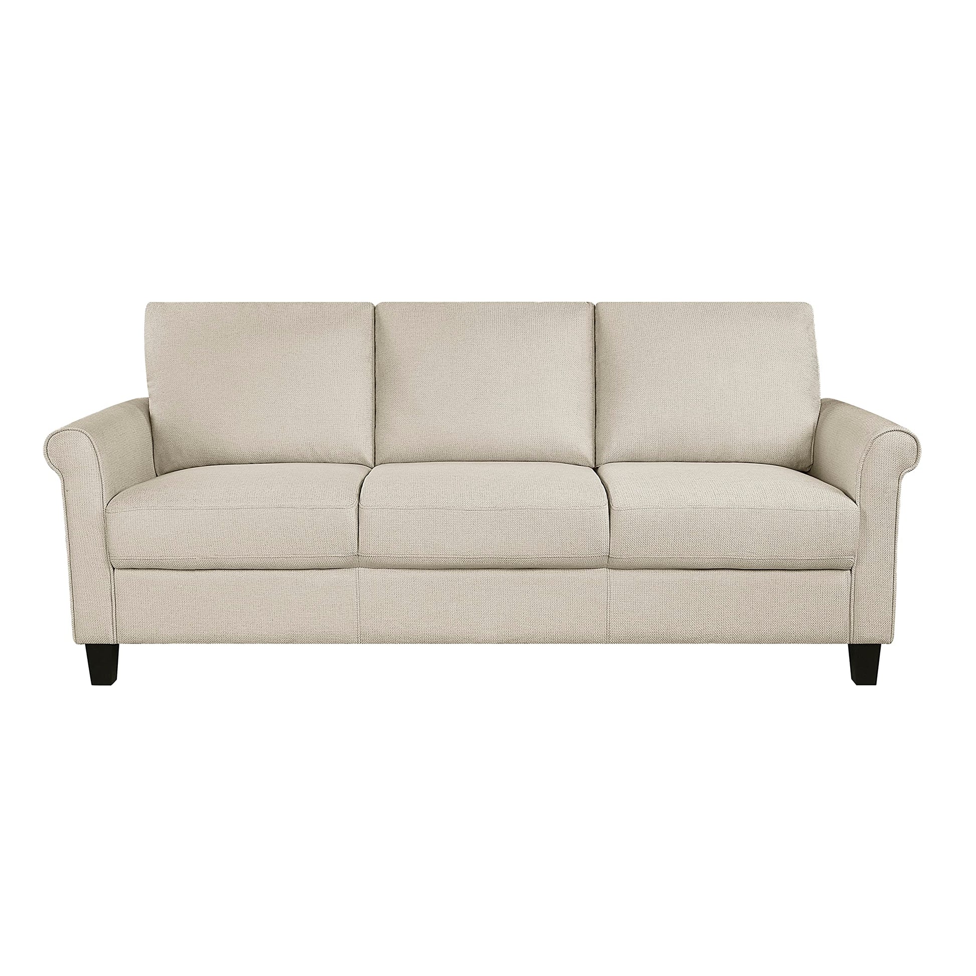 - Beige Textured Fabric Upholstery + Rolled Arm + Loose Back + Attached Seat Cushion