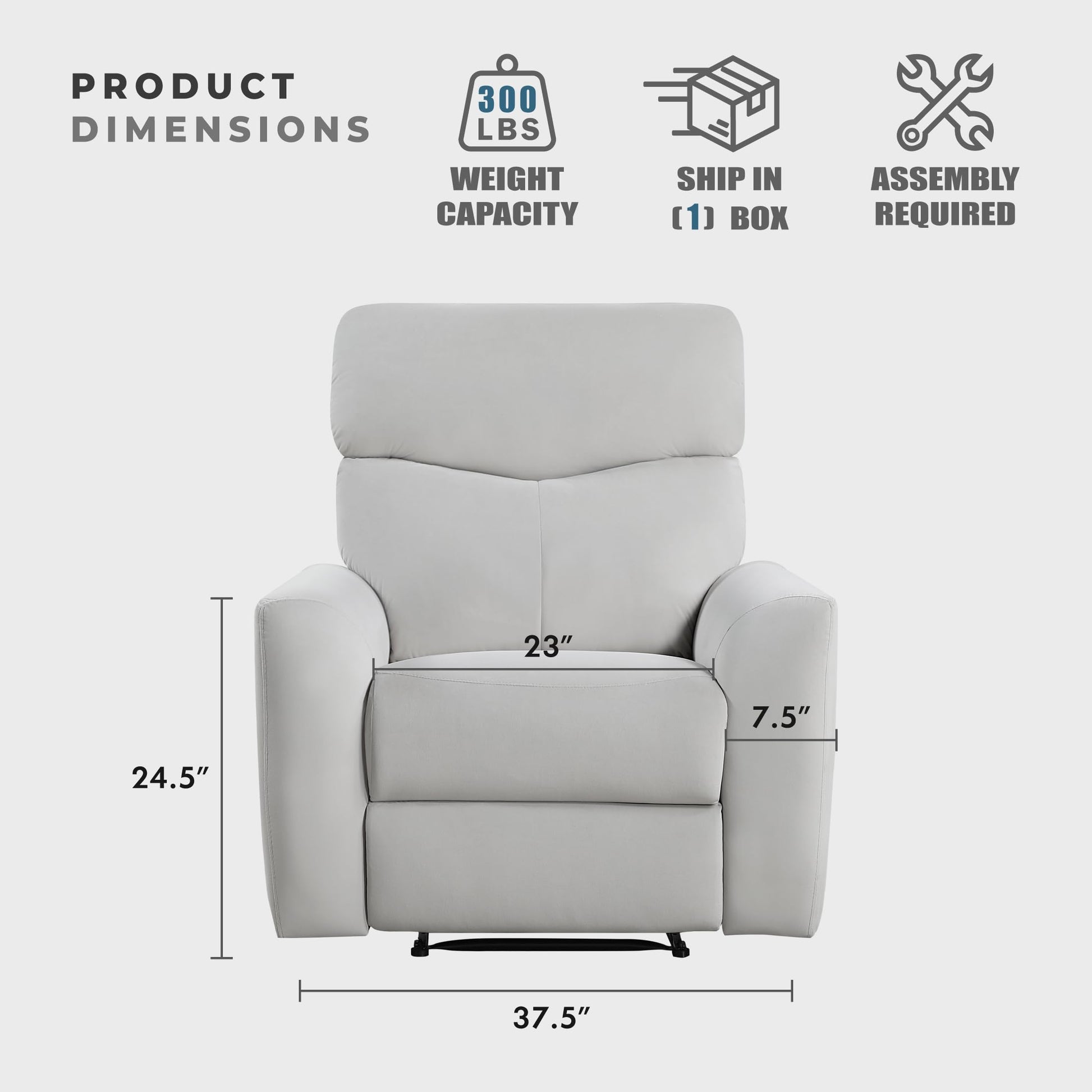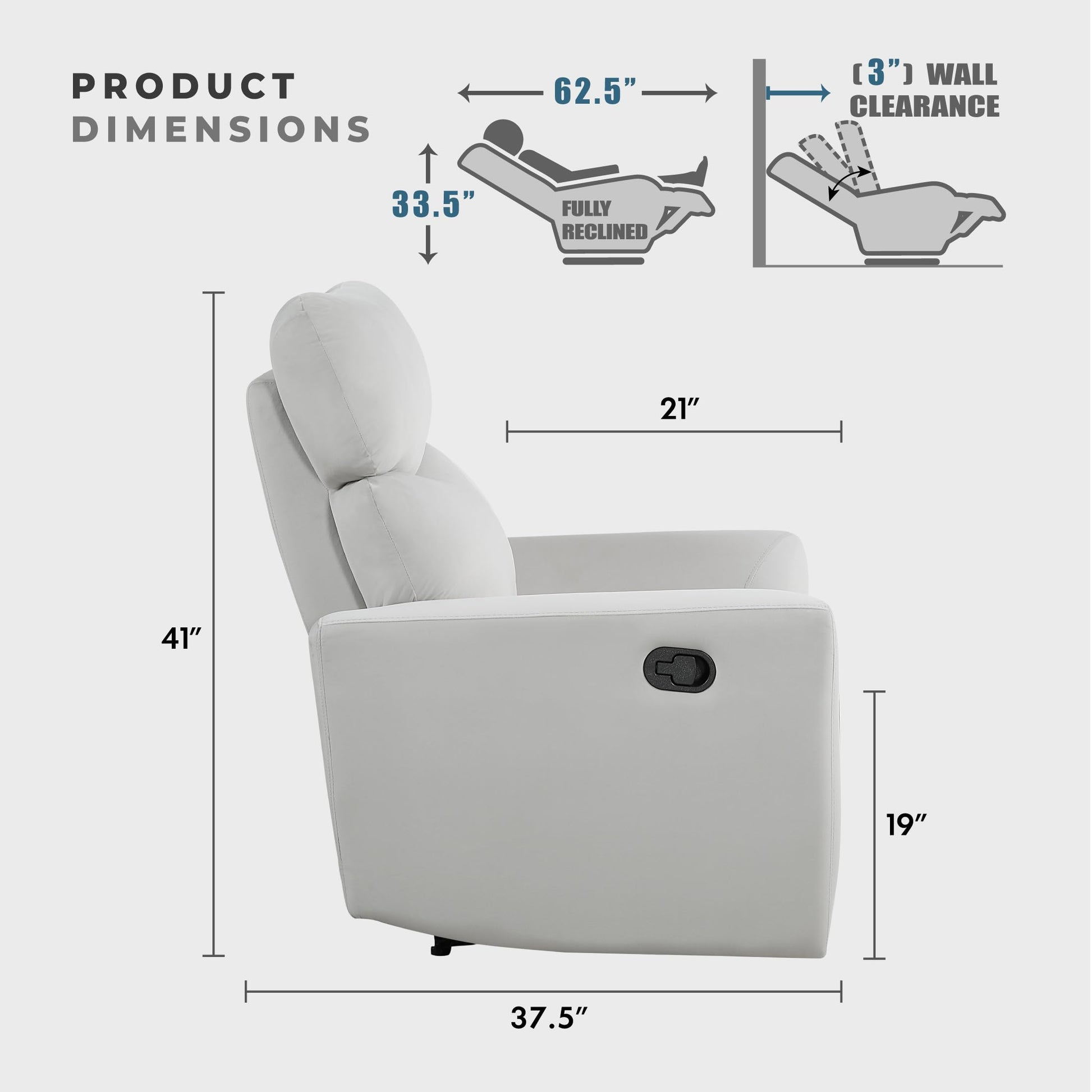 - [Perfect Size & Sturdy] The recliner measures 37.5"W x 37.5"D x 41"H; Seat Width: 23"; Seat Depth: 21"; Seat Height: 19"; Arm Height: 24.5"; Fully reclined length: 62.5"; Fully reclined height: 33.5"; back clearance: 3" with weight capacity of 300 lbs.
