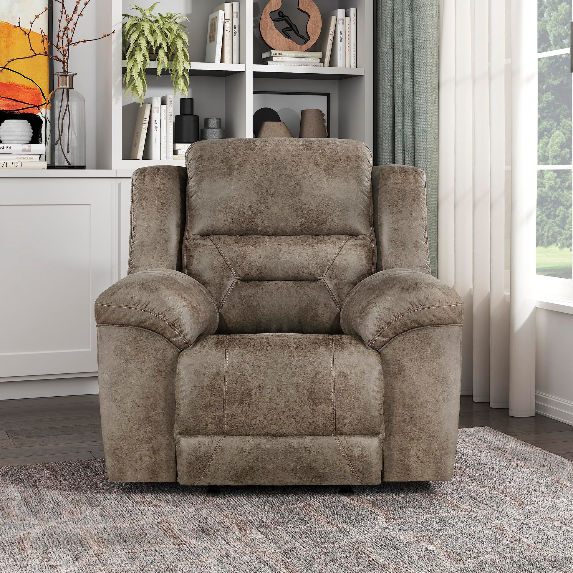 - [Wide Application] This recliner couch has a roomy seat and sets perfectly in your living room. You can never go wrong with deep neutral tones, and the soft faux leather texture adds to its beautifully simplistic appeal in your room.