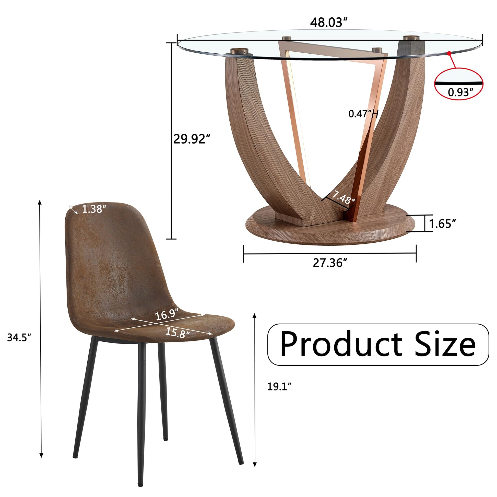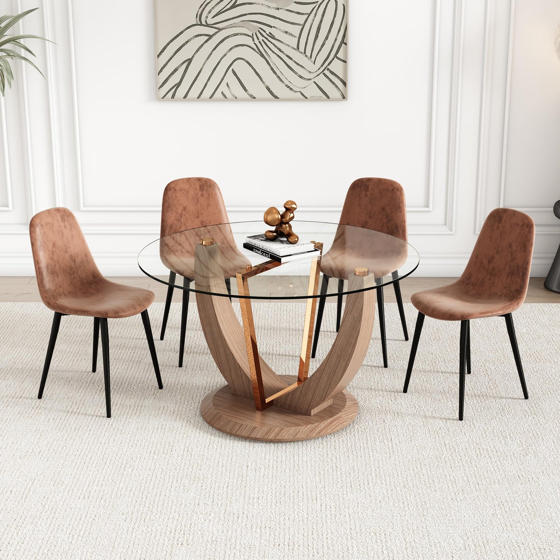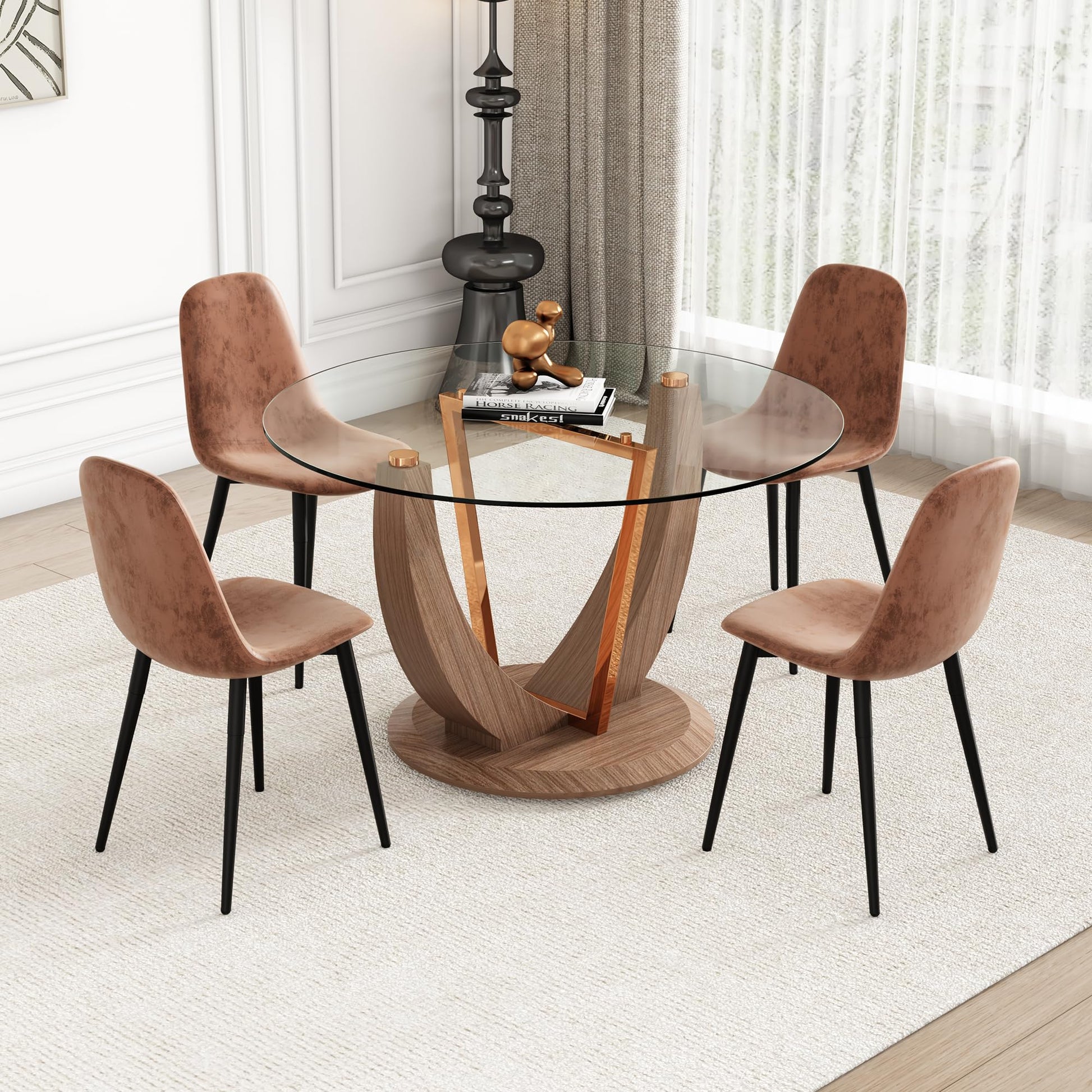 48"Round Dining Table Set for 4,Glass Kitchen Table Set for 4 Brown Chairs