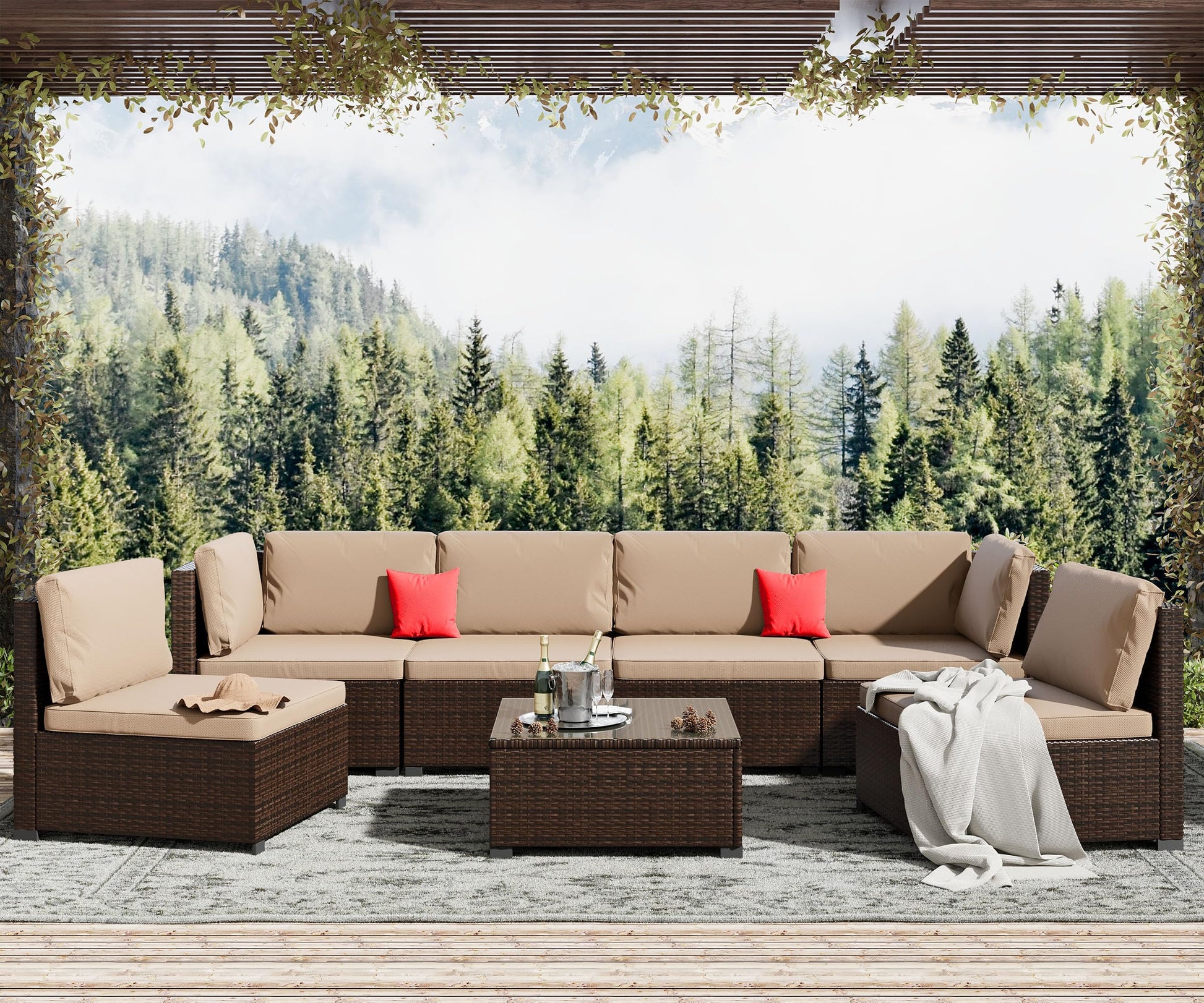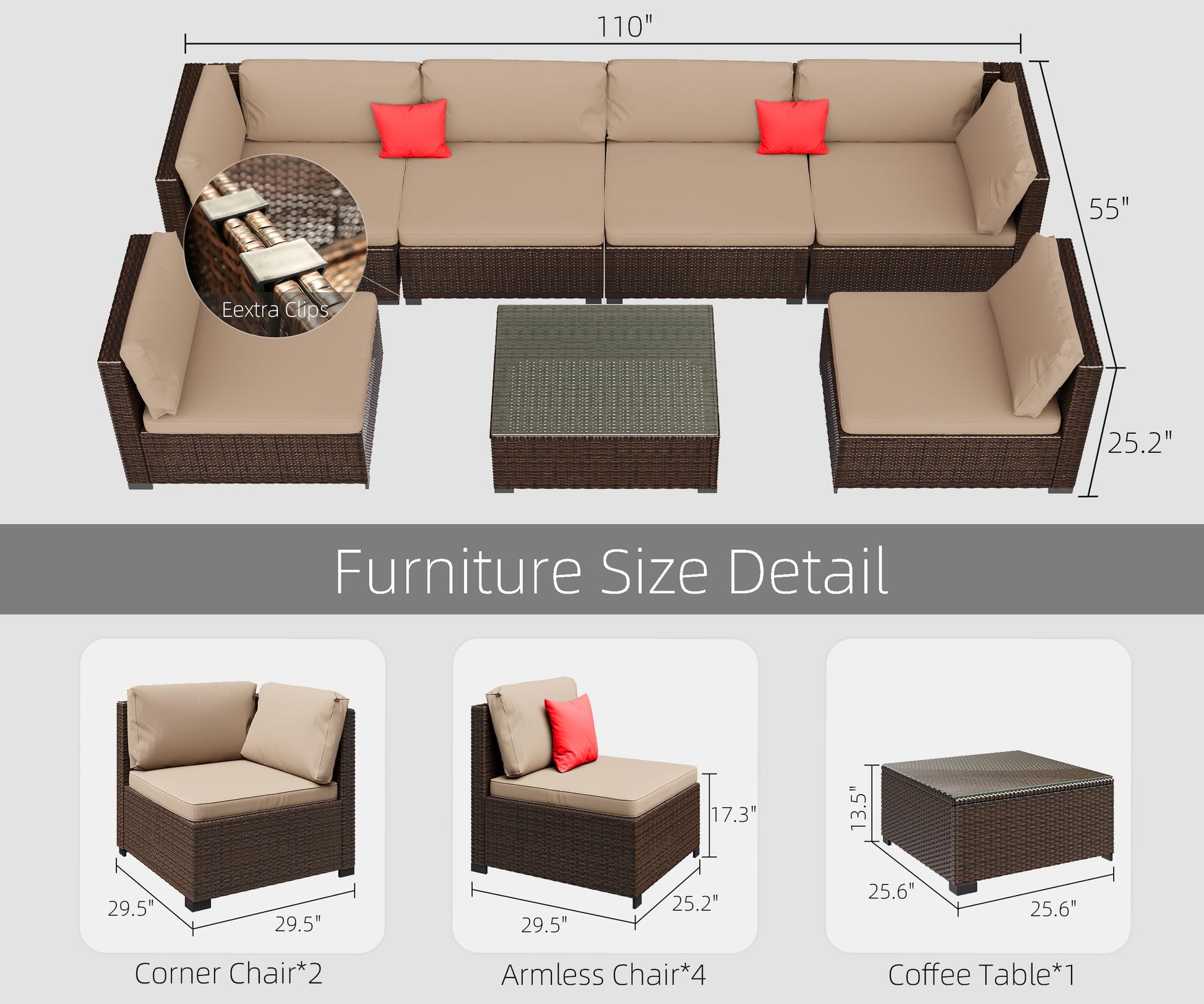 - INFINITE COMBINATION - 7 pieces outdoor sectional sofa includes 2 corner sofas, 4 armless sofas, 1 coffee table with tempered glass top, extra seat clips to keep sofas from sliding apart, adjustable footrest to keep balance. There are 3 boxes in total and they may be delivered in different days.