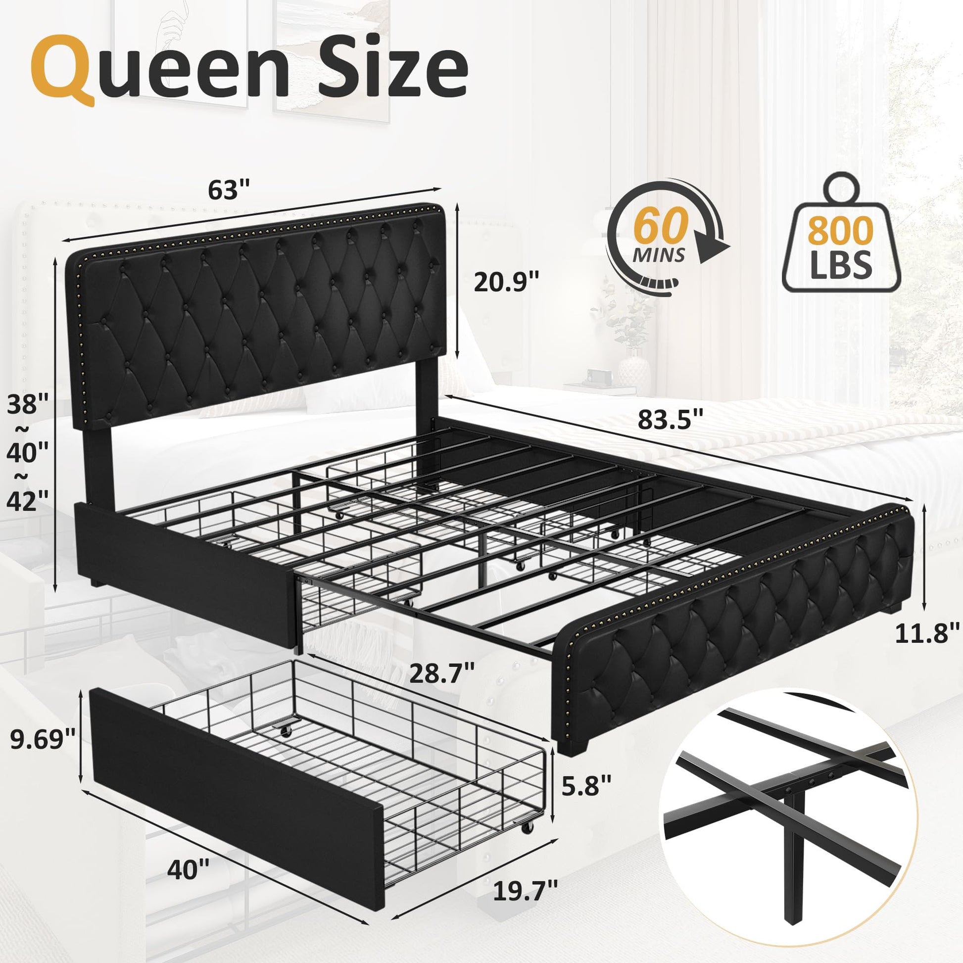 - All-Metal Support: The support system of the bed frame consist of strong metal, which is sturdy and durable. The structure design can easily support up to 800lbs. Mattress can be put on the queen bed frame directly, so it not only gives you a great sense of security, but also lets you simplify your bed preparation.