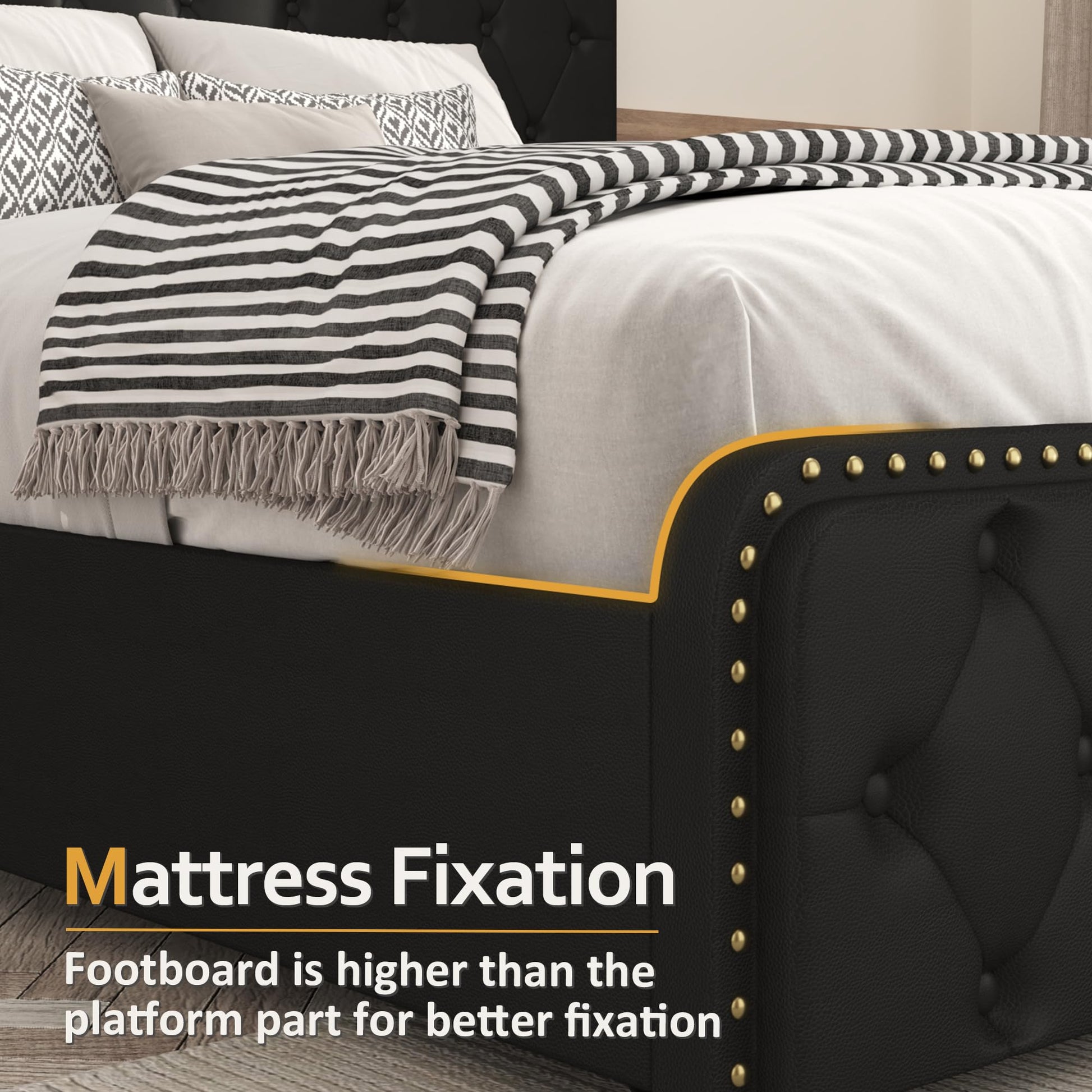 - Faux Leather: The appearance of this bed frame is designed to be fashion and modern, which satisfies the matching of space. Headboard and footboard are wrapped in breathable faux leather, with a built-in high resilience memory sponge. And the button tufted design and rivet embellishments on them are full of the flavor of fashion.