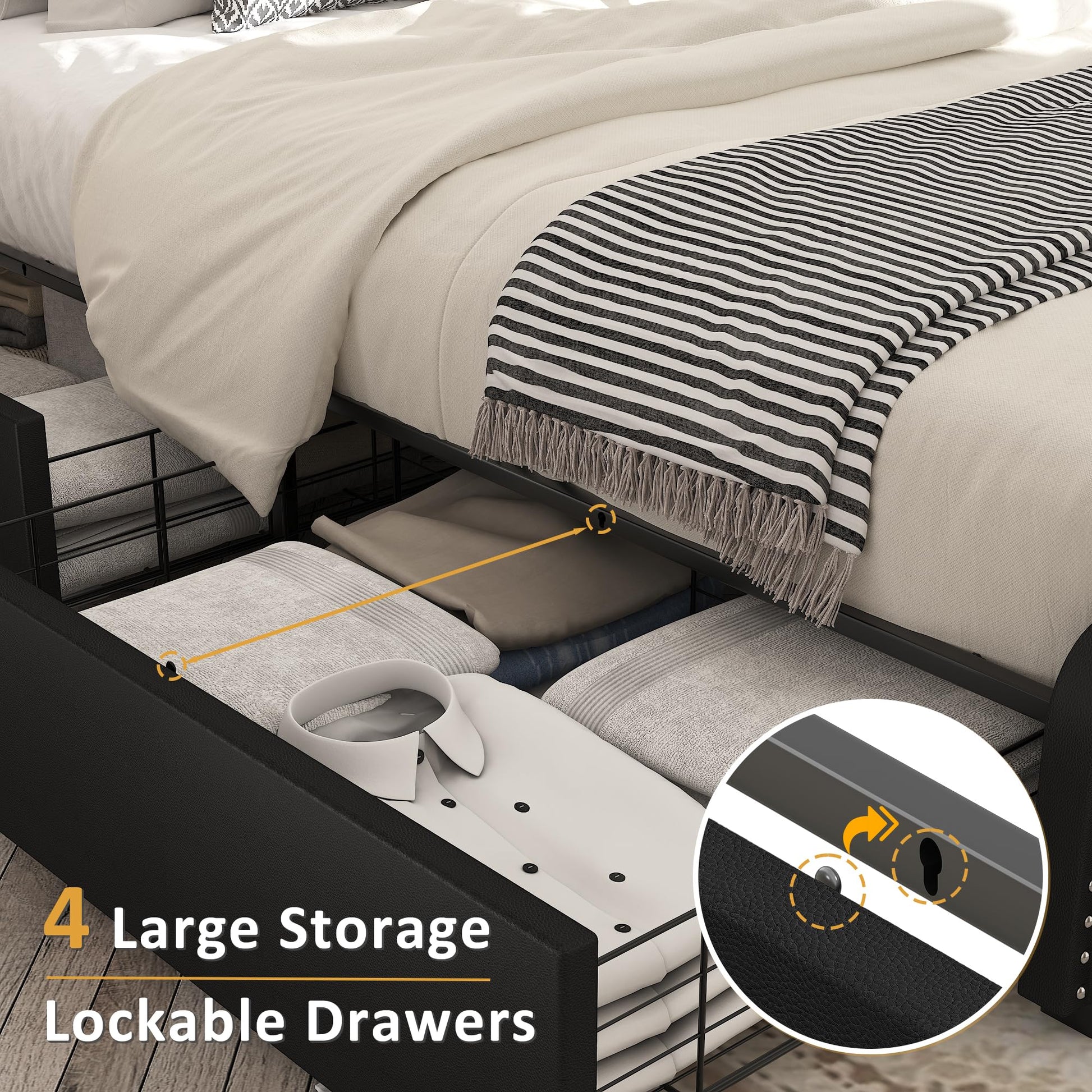 - This queen bed frame is equipped with 4 large storage drawers, which can provide extra storage space for you. With a consistent style, 4 built-in sliding drawers can make your bedroom look tidy and neat. Its lockable design allows you to securely lock the drawers without slipping out when not in use.