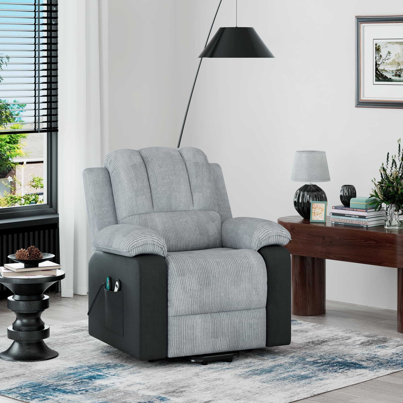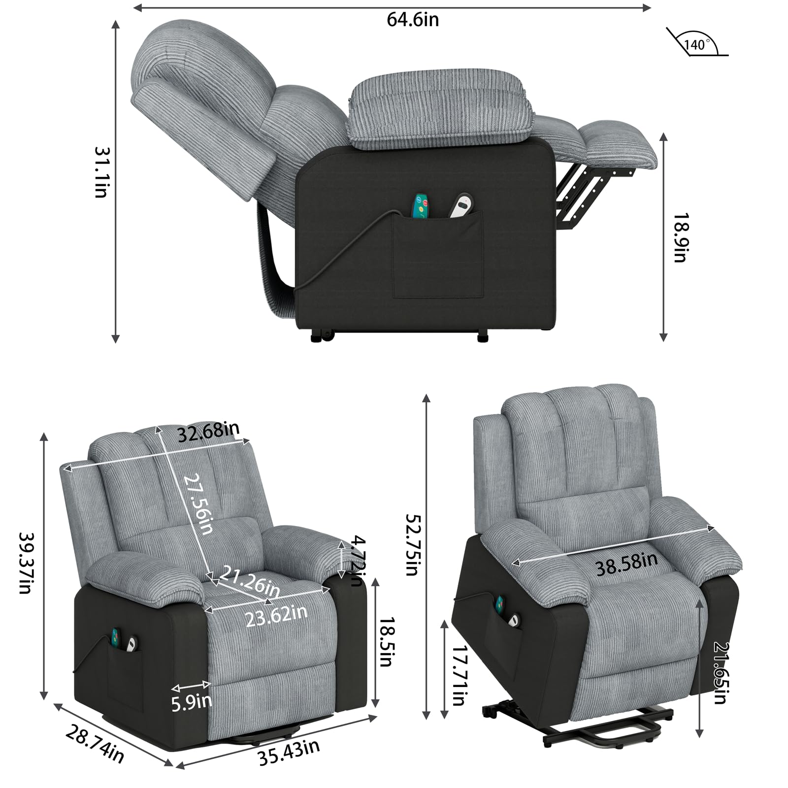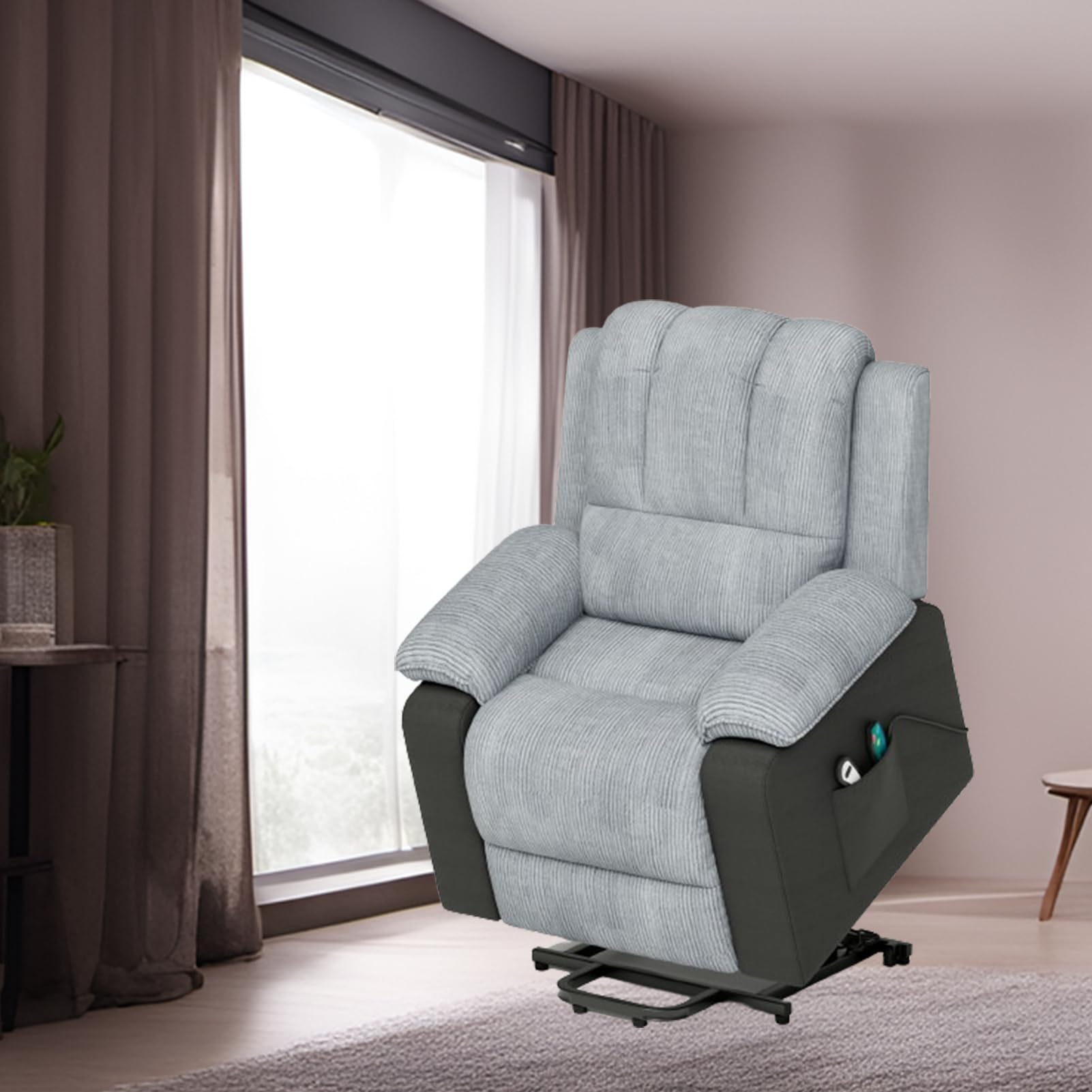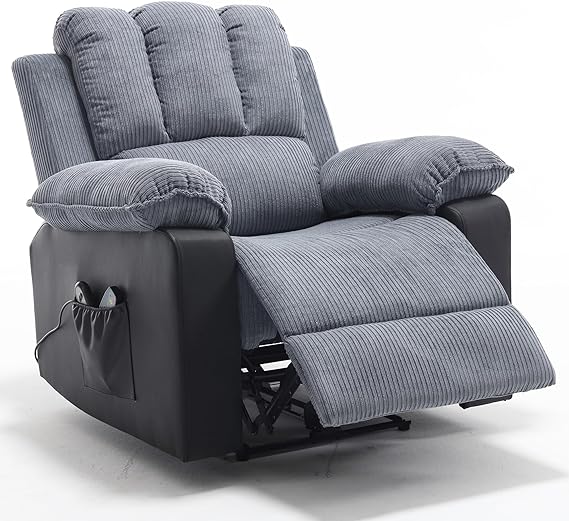 - Standard Electric Recliner Chair Crafted with precision, our recliners boasts high-quality corduroy fabric that is breathable, durable, and irresistibly comfortable. The seat is generously filled with high-density sponge for a luxurious sitting experience, while independent pocket springs provide flexibility and long-term durability. The sturdy wood and metal frame ensures stability.