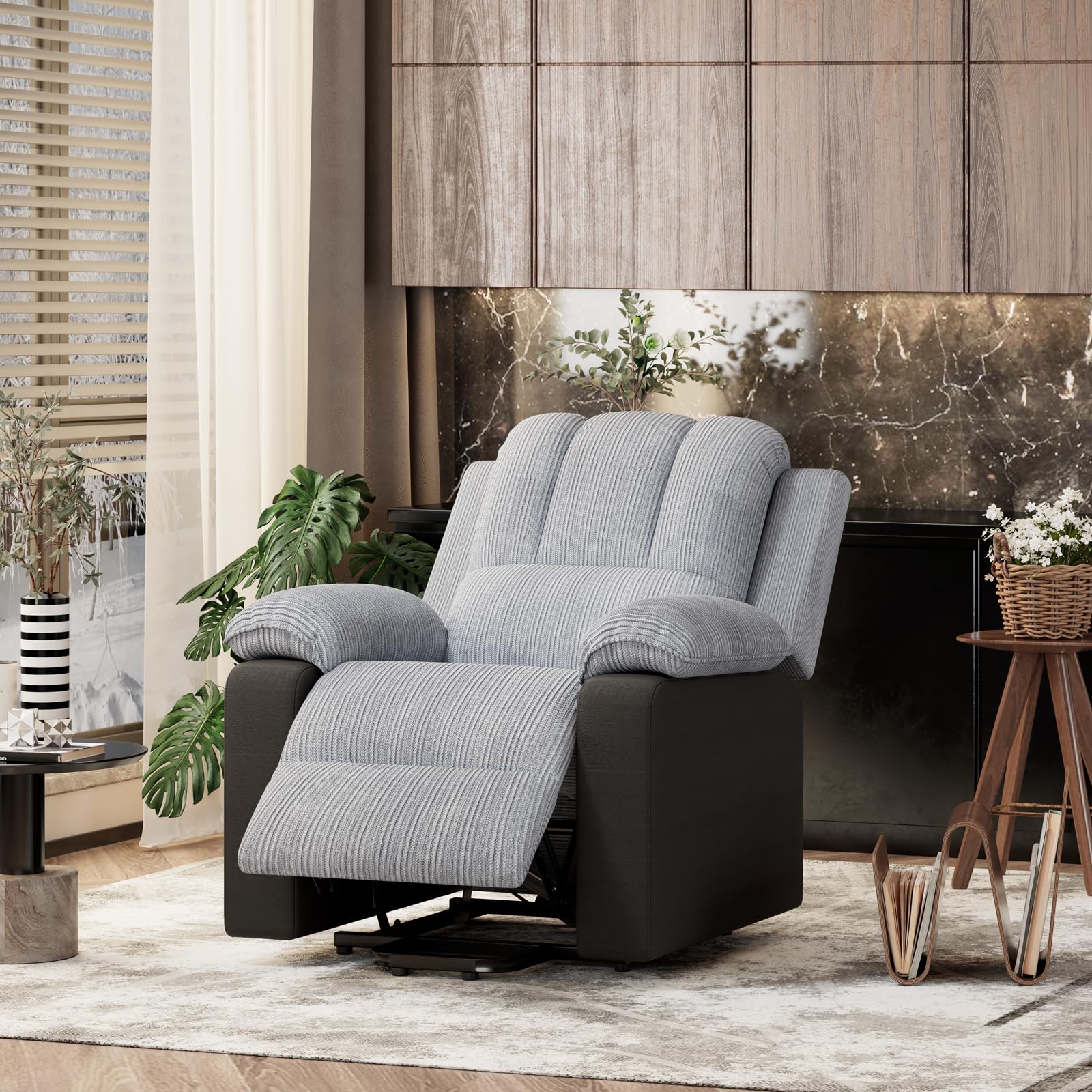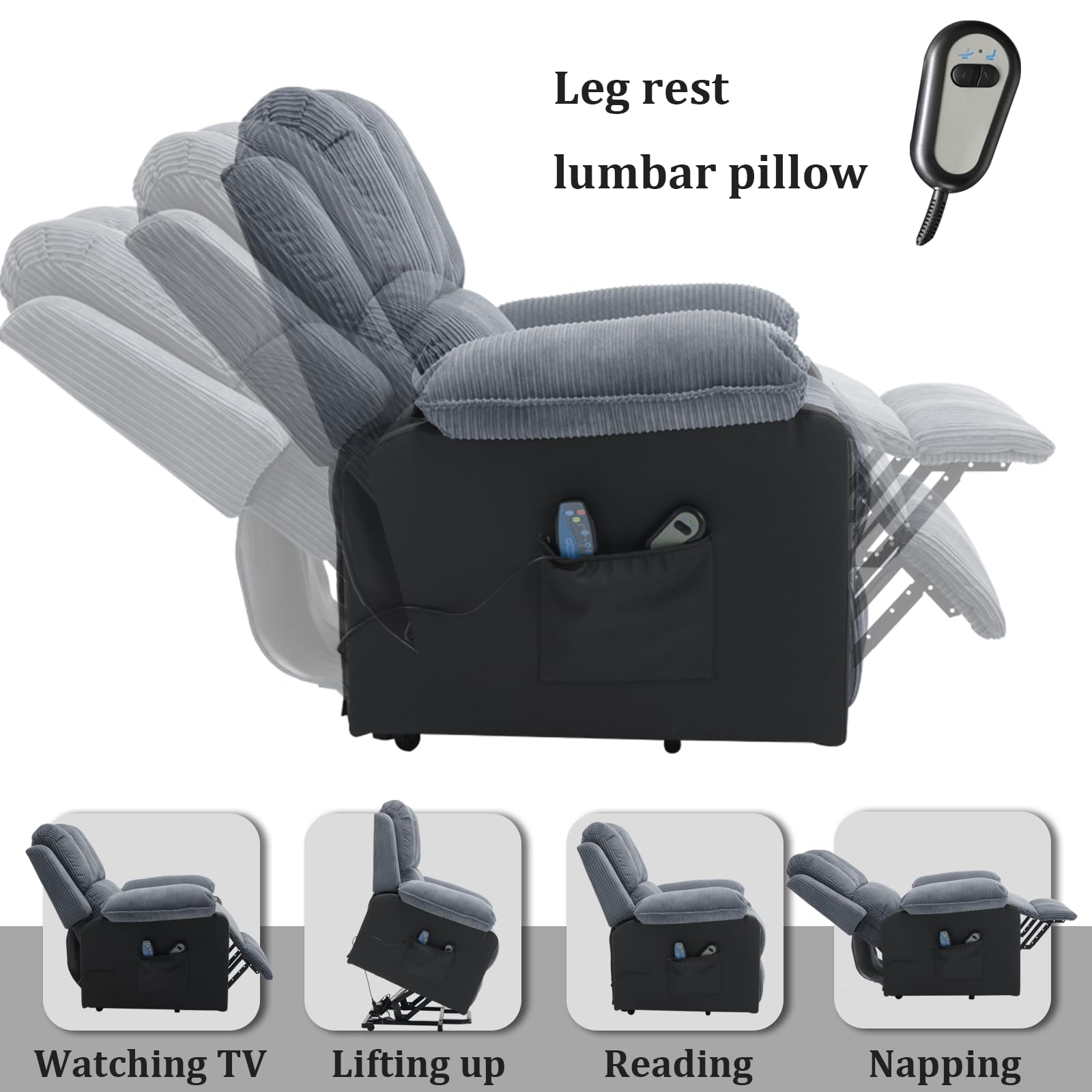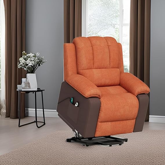 - Standard Electric Recliner Chair Crafted with precision, our recliners boasts high-quality corduroy fabric that is breathable, durable, and irresistibly comfortable. The seat is generously filled with high-density sponge for a luxurious sitting experience, while independent pocket springs provide flexibility and long-term durability. The sturdy wood and metal frame ensures stability.