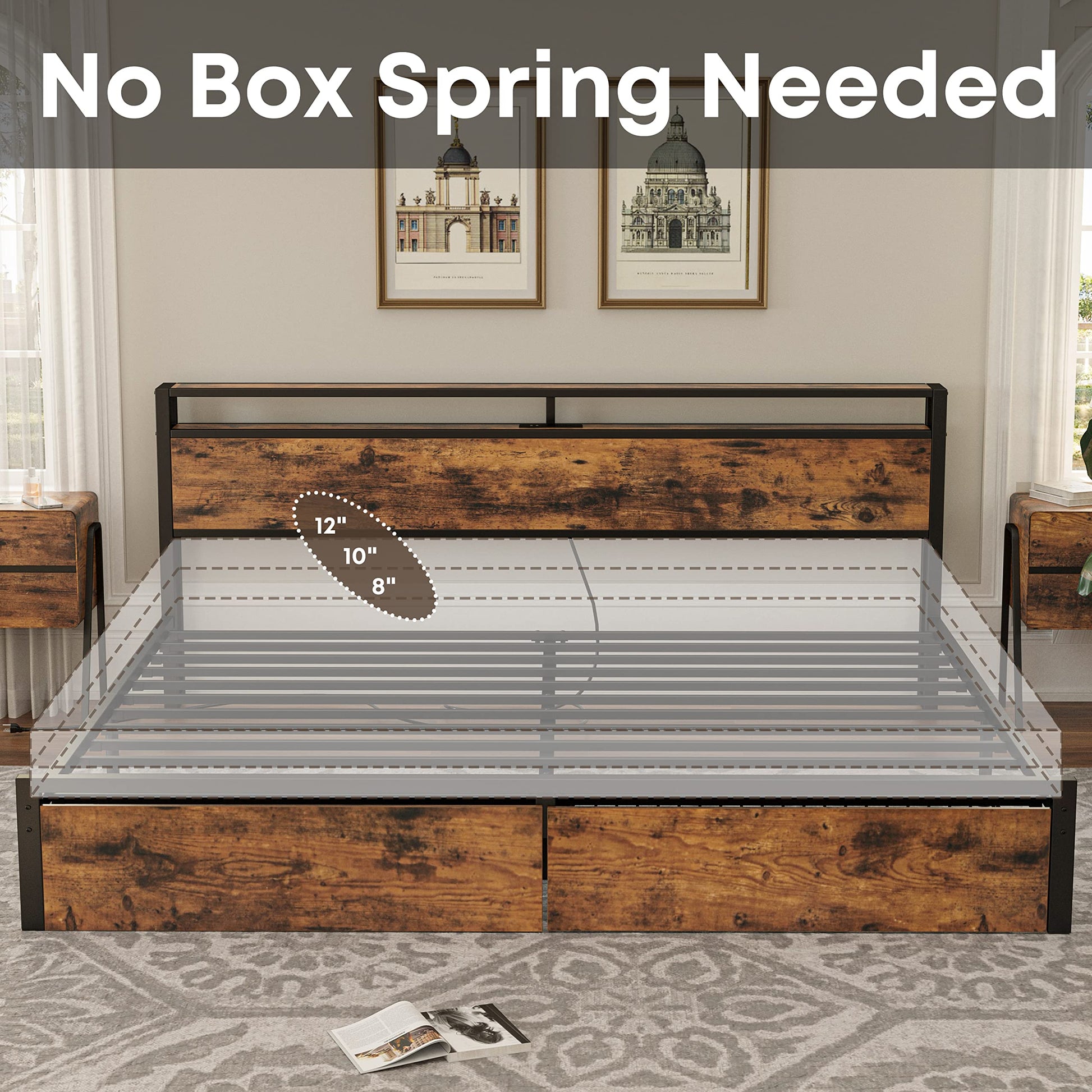 - The king bed is made of a heavy-duty metal frame and metal slats providing optimum support for all types of mattresses without the use of a box spring. Weight capacity: 1200 lbs.