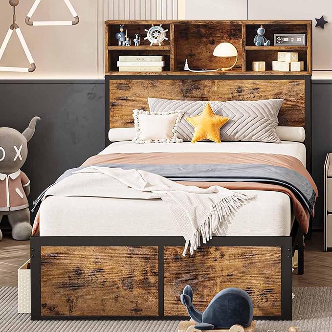 - Tall Bookcase Headboard with Charging Station: headboard feature 5 open storage cubies in varying sizes, and built in charging station with 2 Standard Plug Outlets & 2 USB Ports.