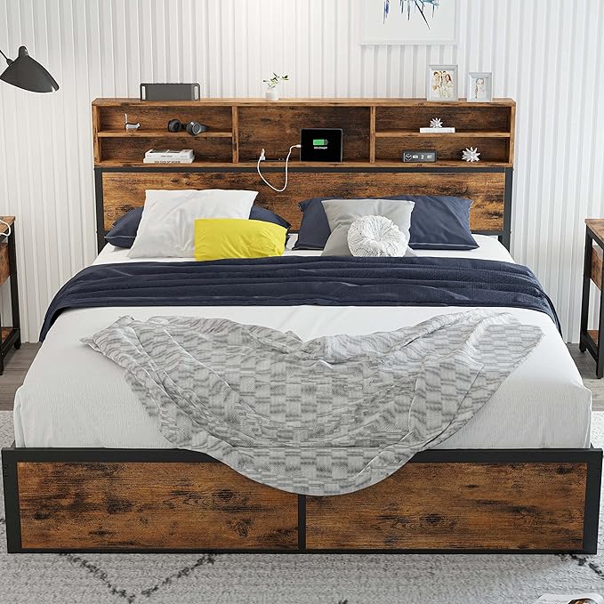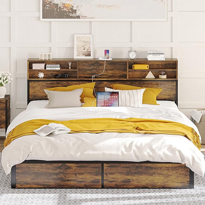 Queen Bed Frame with Tall Bookcase Headboard and Charging Station, Sturdy and No