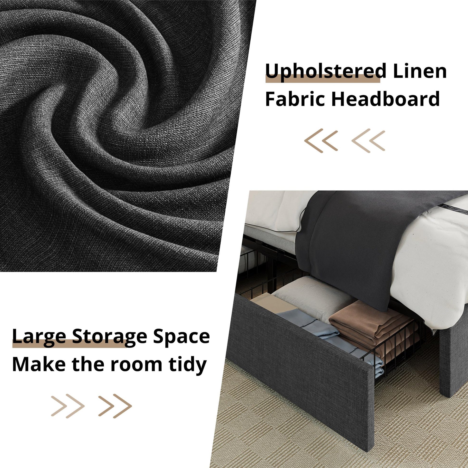 LIKIMIO Queen Bed Frame with Upholstered Headboard, Platform Bed with Storage Drawers and Outlets, Sturdy, Noiseless, No Box Spring Needed, Easy Assembly, Dark Gray