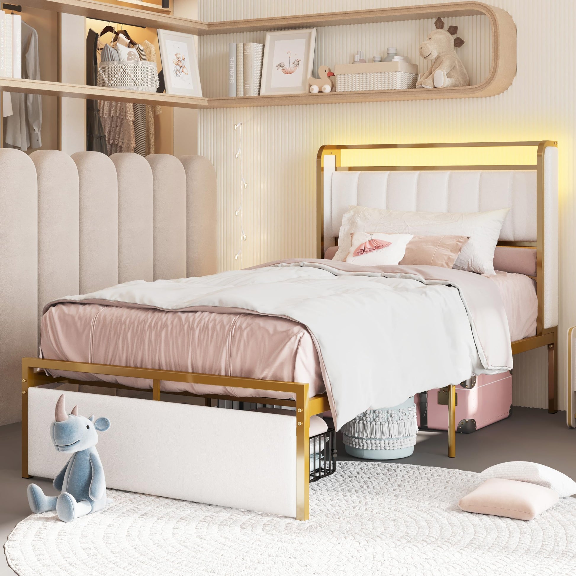 - The opulent blend of gleaming golden iron and soft beige-white upholstery creates a stunning, sophisticated aesthetic that adds a touch of luxury and elegance to any bedroom.