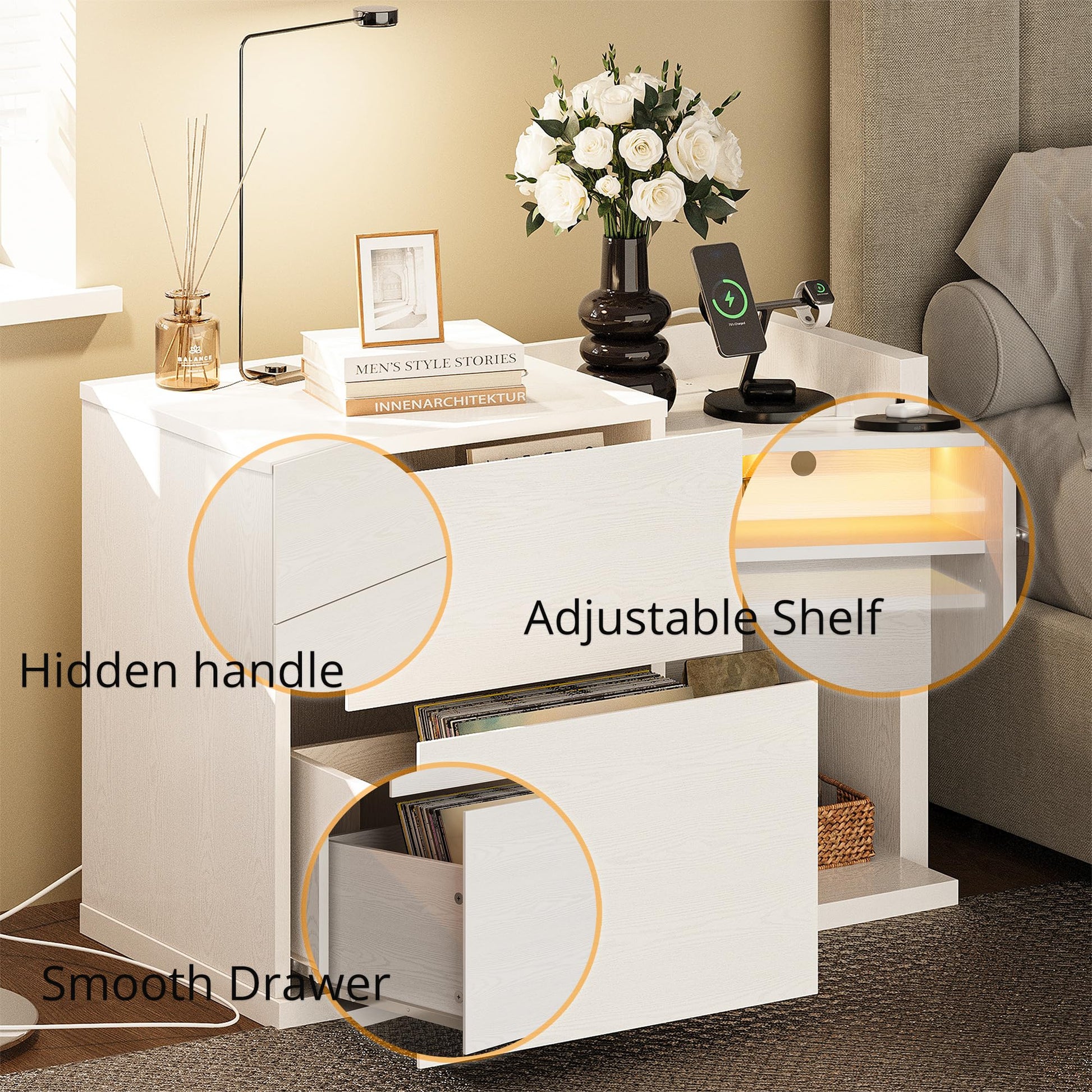 White Night Stand with Shelves, Charging Station & LED, 2 Drawer Wooden Bedside Table