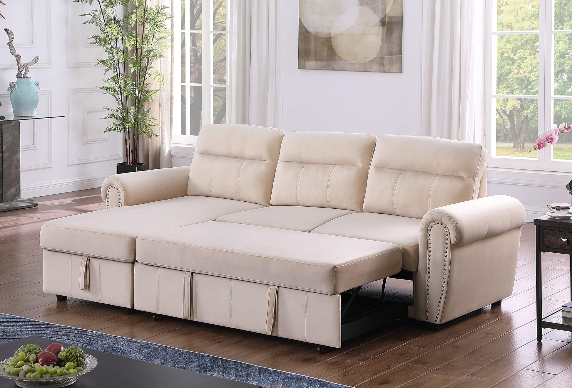 Ashton Beige Velvet Fabric Reversible Sleeper Sectional Sofa Chaise