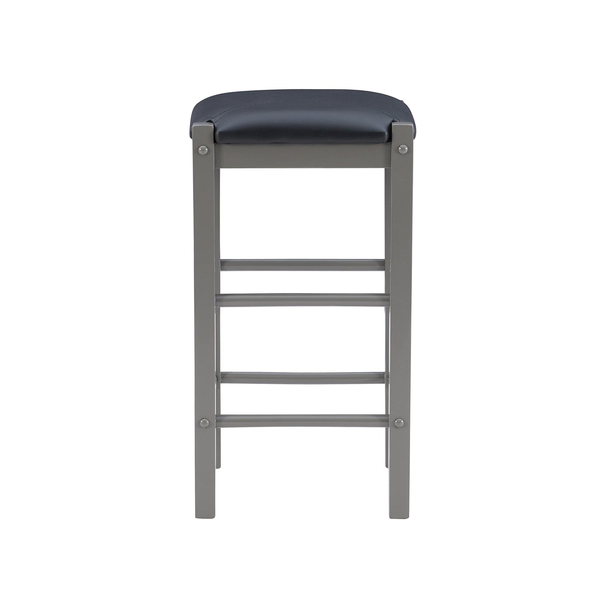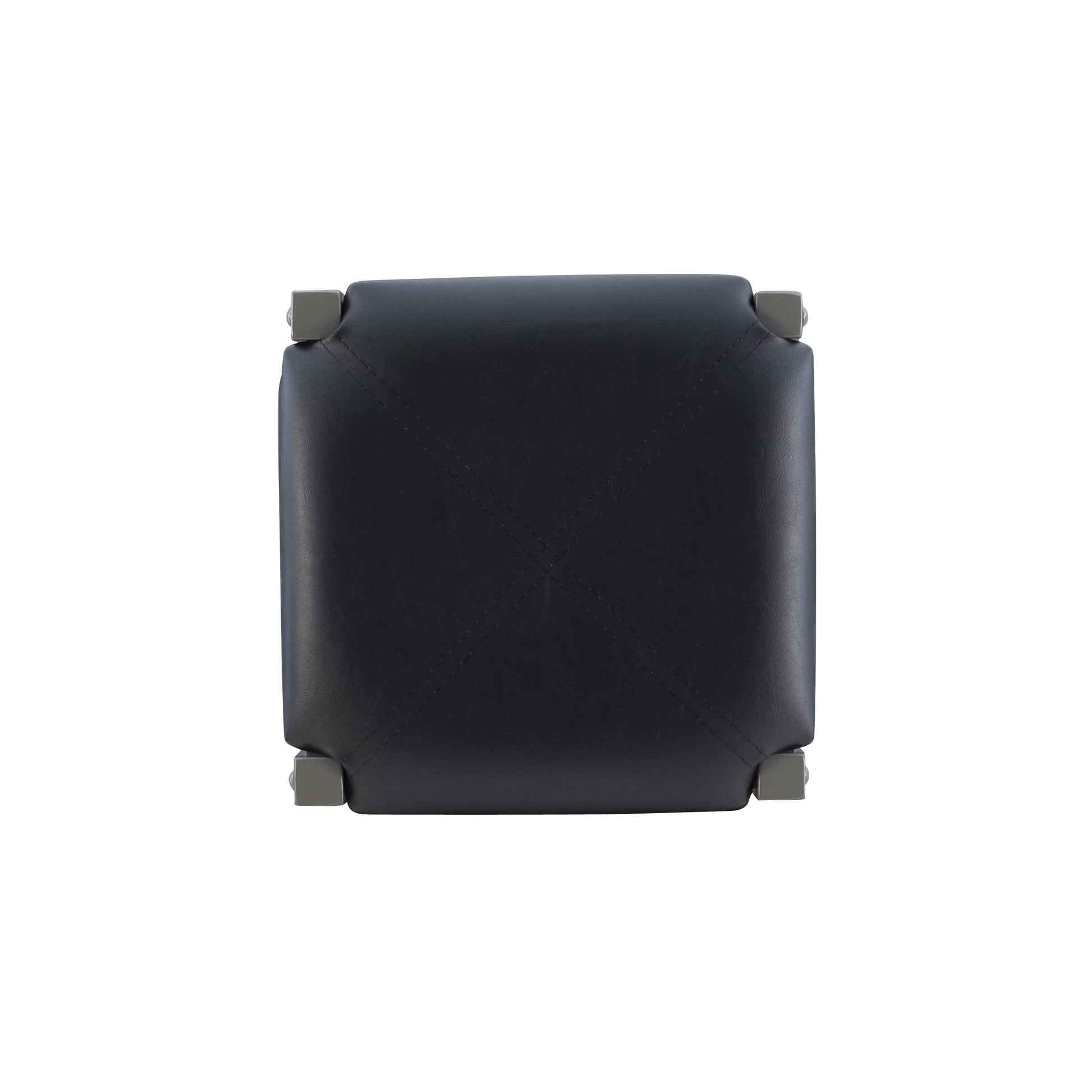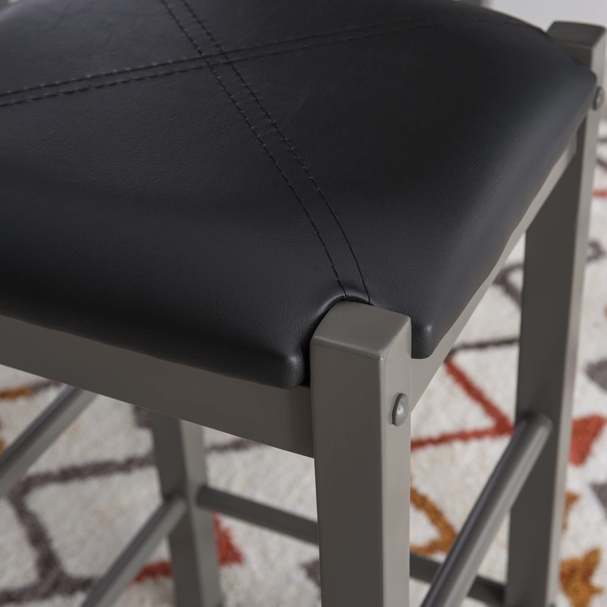 - Padded stool seats with black faux leather upholstery; stools tuck under table seemlessly for easy storage.