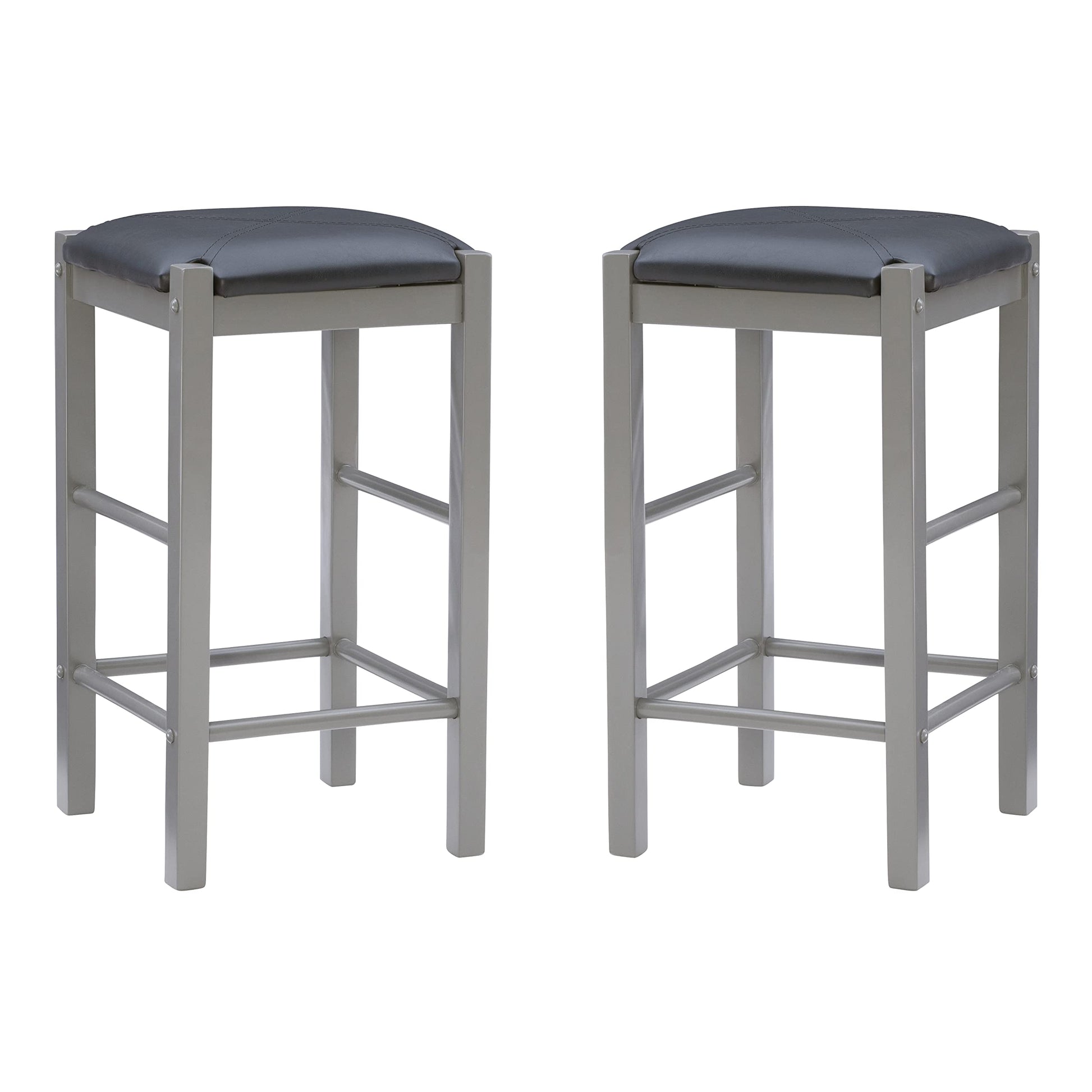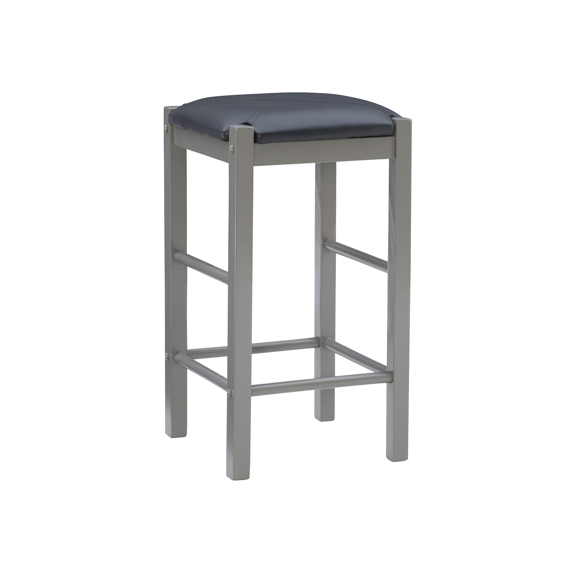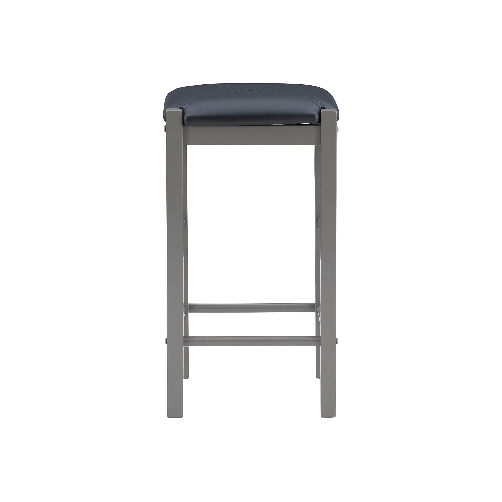 - Padded stool seats with black faux leather upholstery; stools tuck under table seemlessly for easy storage.