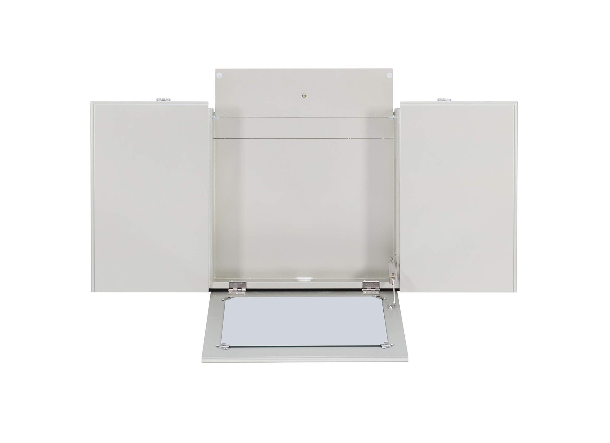 - Convenient flip top mirror with a safety stay hinge allows access to open storage beneath