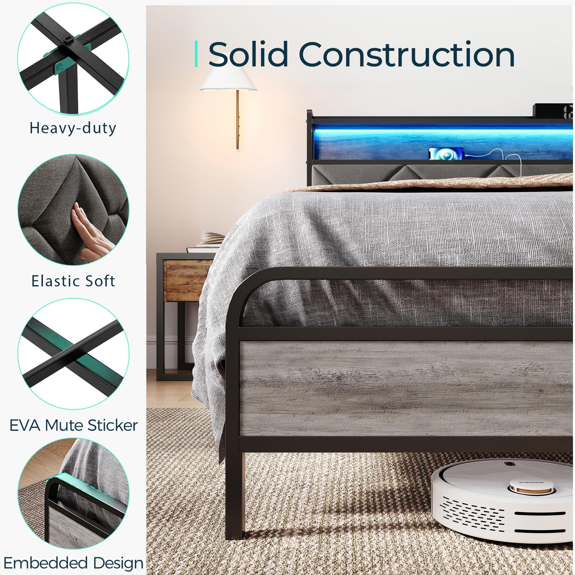 - RGB LED LIGHT & CHARGING STATION: This bed frame supports the headboard RGB LED light. The light supports 20 vibrant colors, 8 brightness levels, and 20 dynamic modes. The controller is installed on the headboard, convenient to change the light when you are lying on the bed, you can easily set the perfect atmosphere for any occasion. The built-in charging station includes AC outlet, USB port, and Type-C port, making it easy to charge your devices while lying in this bed, no worry about the low!