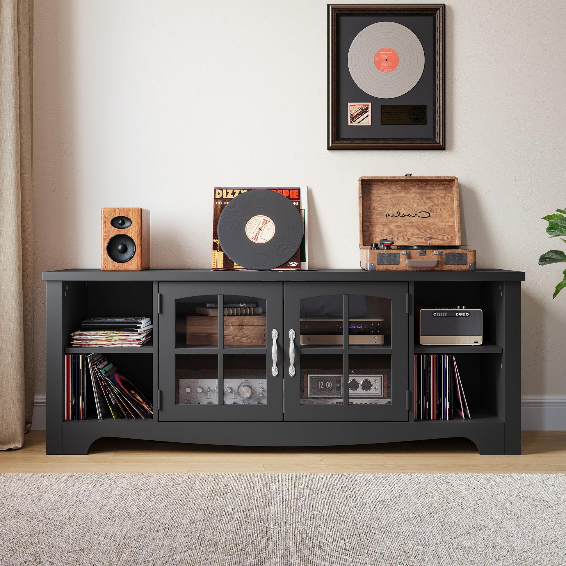 - Say Goodbye to Messy Media Center - Organize your entertainment accessories with height adjustable shelves and side cabinets, plus 2 layers of display space with glass doors. This wood TV stand is perfect for any size of the living room.