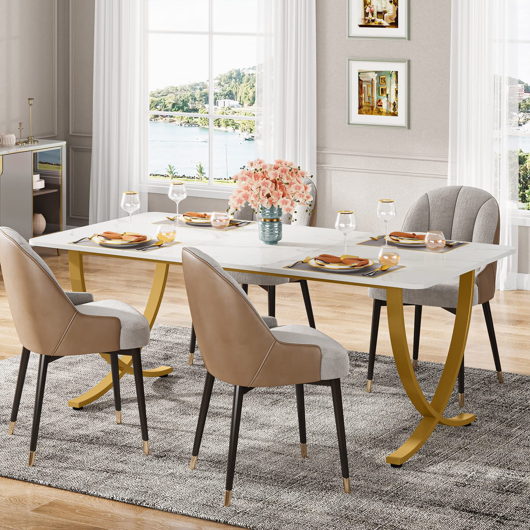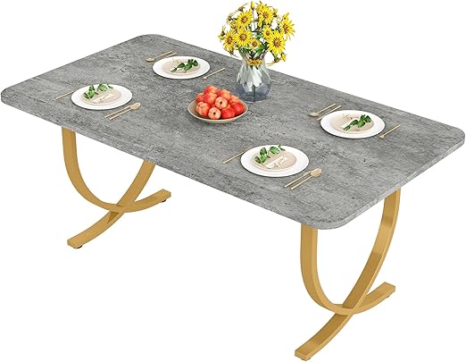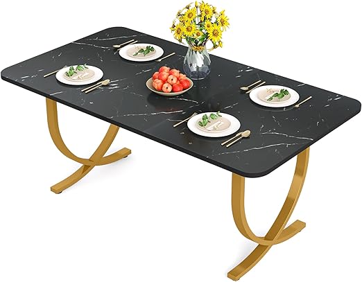 - This modern dining table is a really stunning piece of "art" furniture. The gorgeous faux marble tabletop brings a magnificent and airy feeling to the dining atmosphere, this style is timeless and powerful. unique geometry gold metal thickened table legs provide practical security and a stylish and luxurious atmosphere for your dining. you'll get tons of compliments every time someone enters your home.