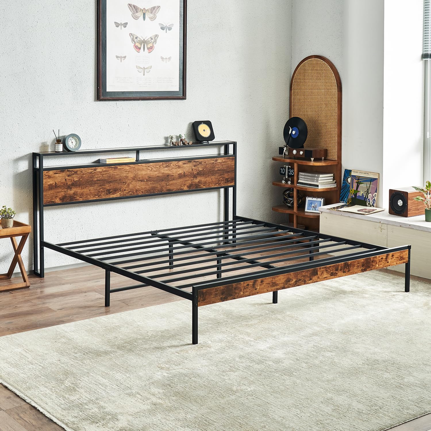 Size Bed Frame, Platform Bed Frame with 2-Tier Storage Headboard