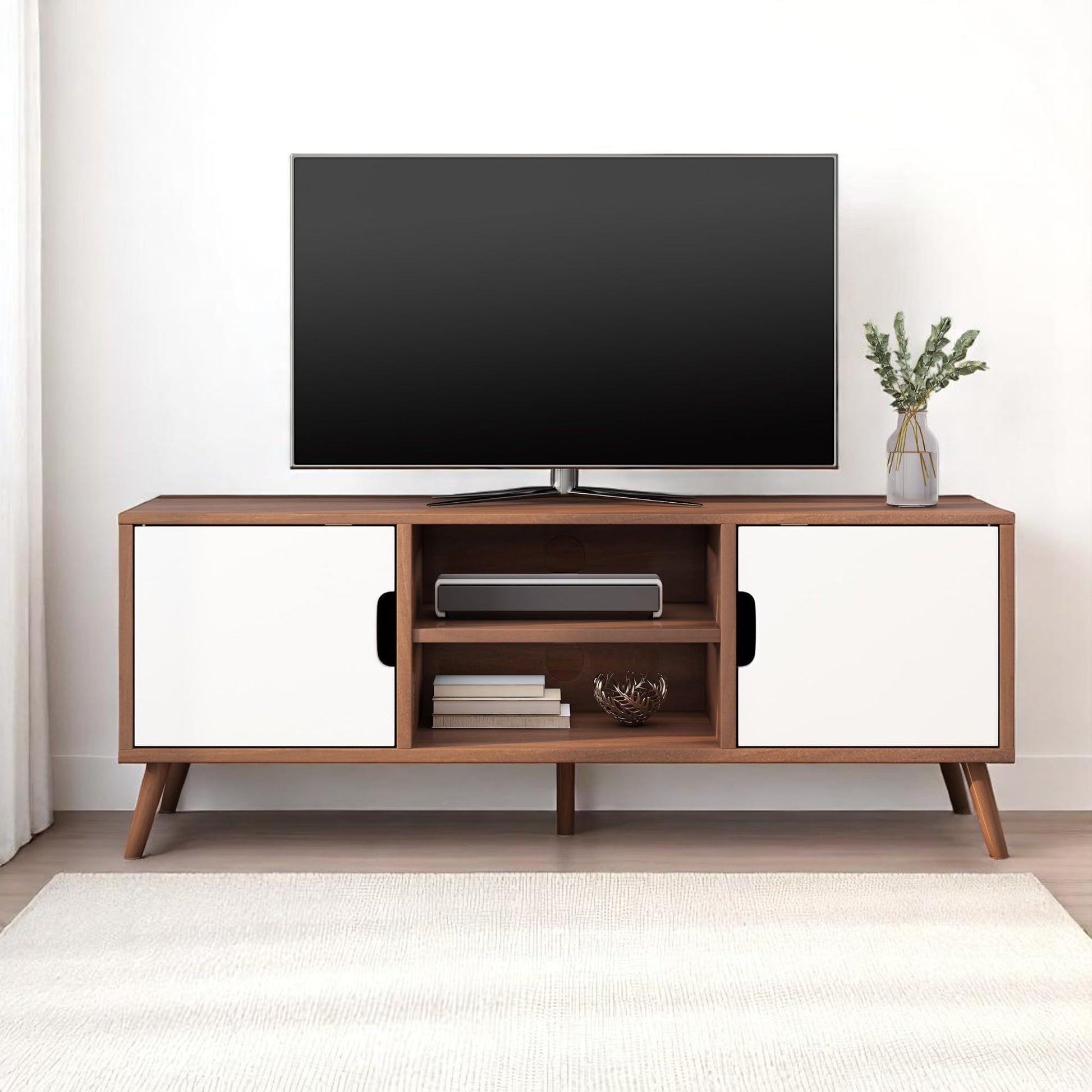- Mid-Century Modern Design – This stylish TV stand features iconic splayed pine legs and a sleek, understated wood frame, perfect for adding a mid-century modern flair to your living room or entertainment area.