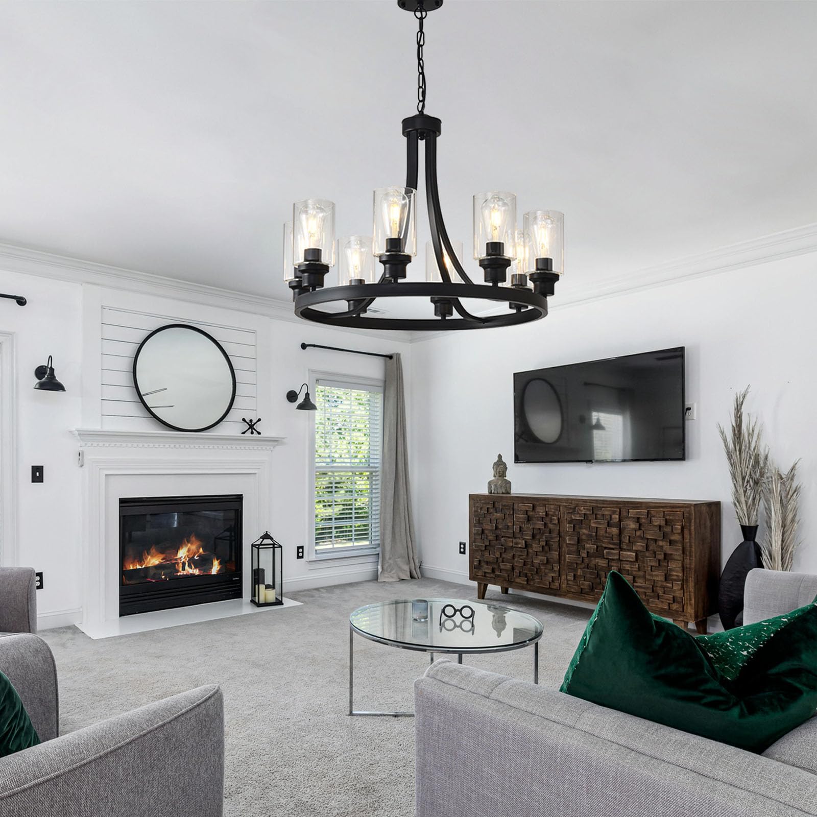 - 【Modern Farmhouse Chandelier】The black chandelier light fixture features a carriage wheel style circular frame with a transparent cylindrical glass lampshade, providing 360 ° light coverage, showcasing the modern farmhouse style.