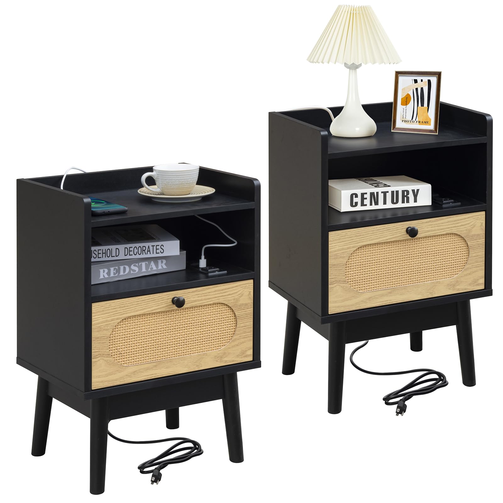 Rattan Nightstand Set of 2, Bedside Table with Charging Station, Modern Night Stand